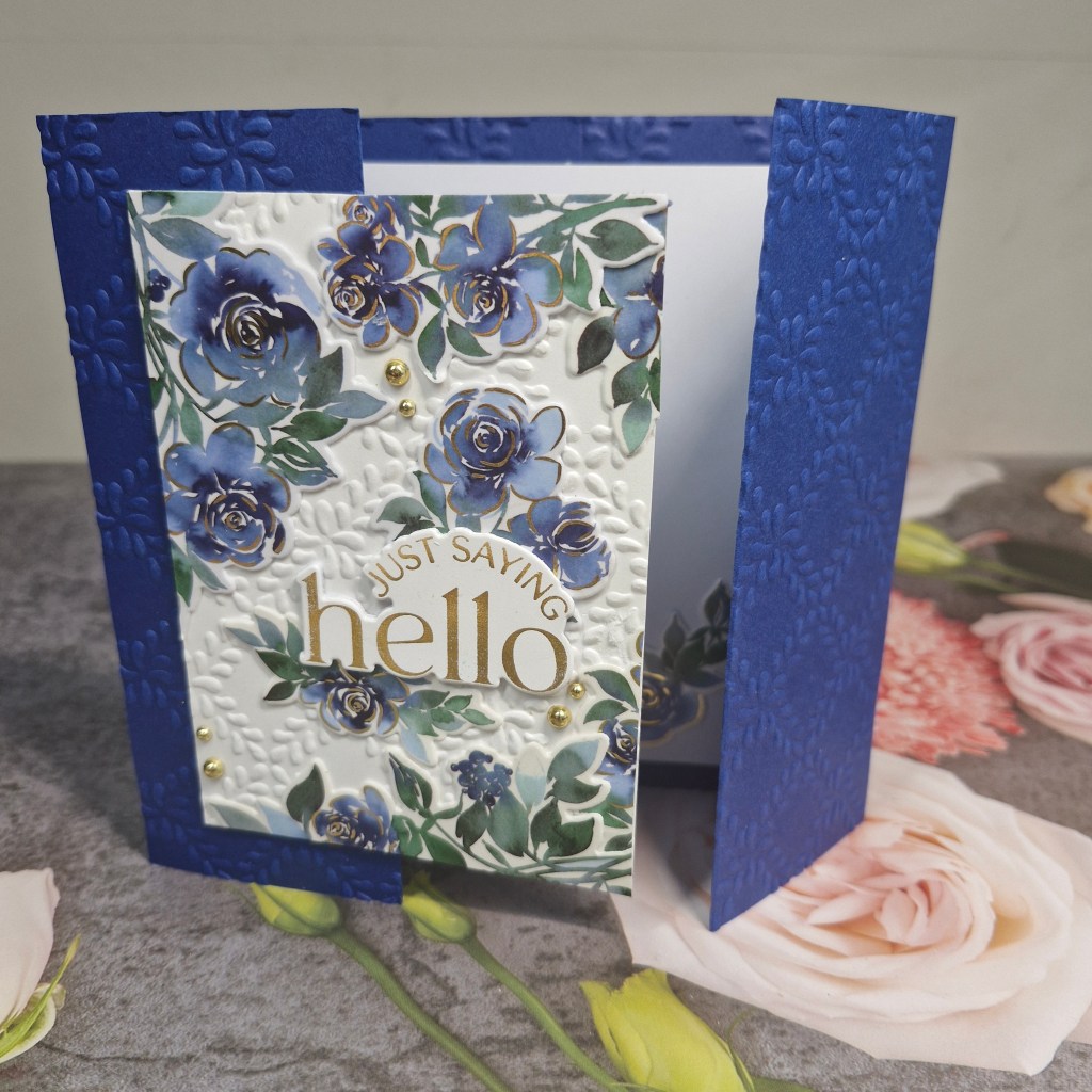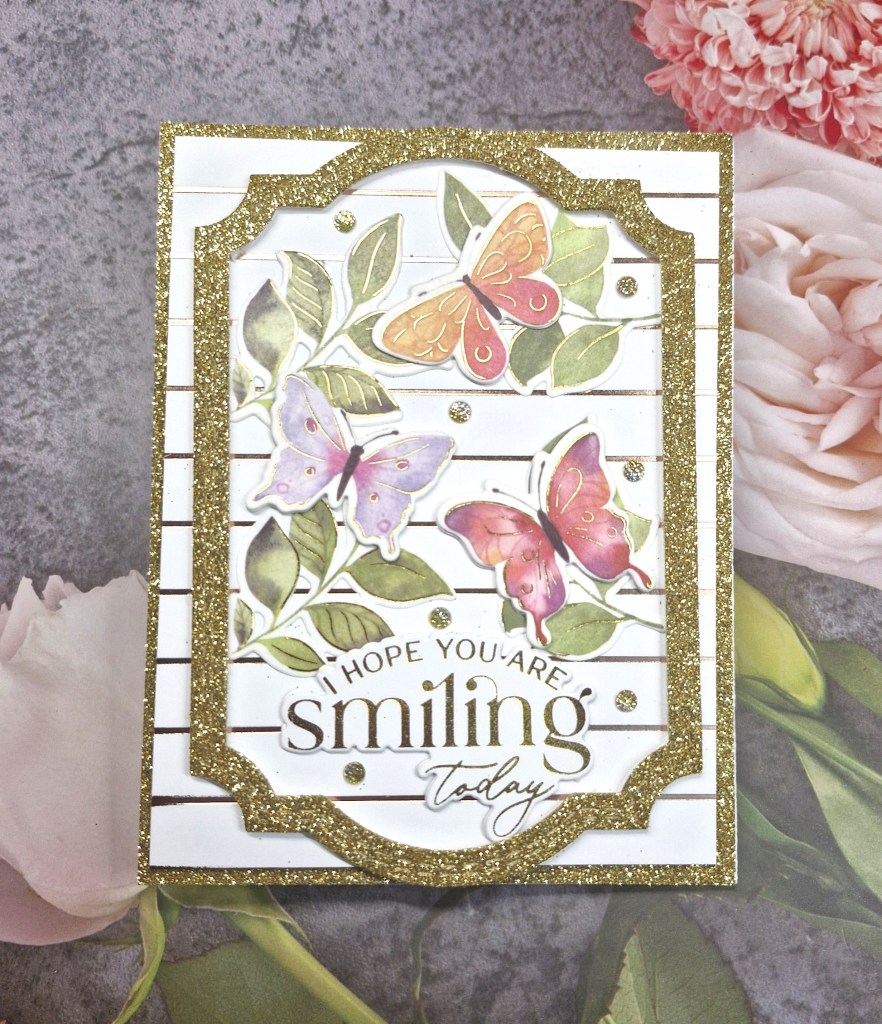 As I arranged them, I decided to add a panel at the back embossed using a Spellbinders embossing folder, and die cut a white frame using Pinkfresh Studio ‘art Deco Frame’. The fame was added using 3D foam squares in various places – I didn’t use foam strips as I didn’t really know if I wanted any of the foliage tucked underneath the frame as yet.