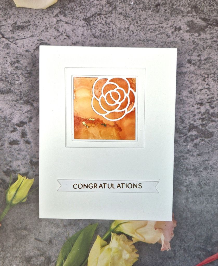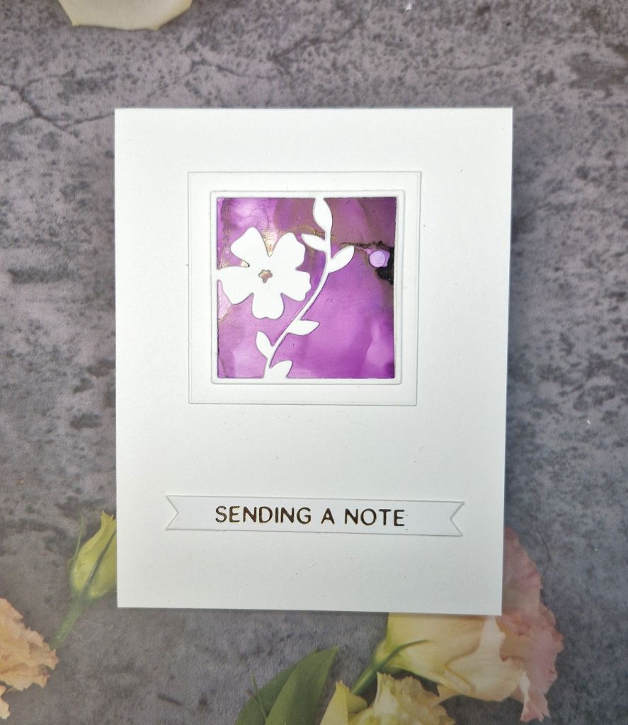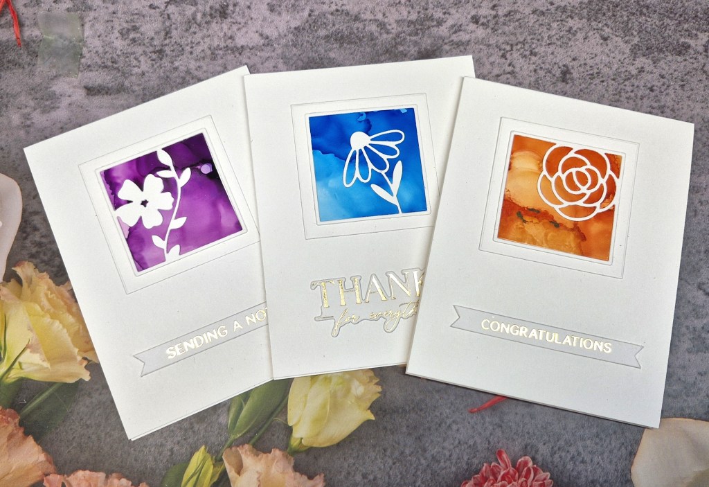 I then die cut the floral squares out of white, adding frames around with some nesting square dies, then die cut the alcohol ink panels and glued them to the back.