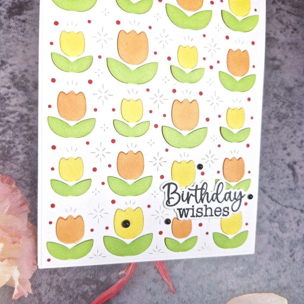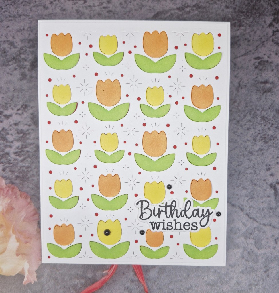 I have a card to share inspired by the current challenge at Festive Friday. When I saw their them was National Tulip Day, and aw the list to choose three items from the list, I remembered I had this die and stencil set from Waffle Flower that I have never used – time to play: