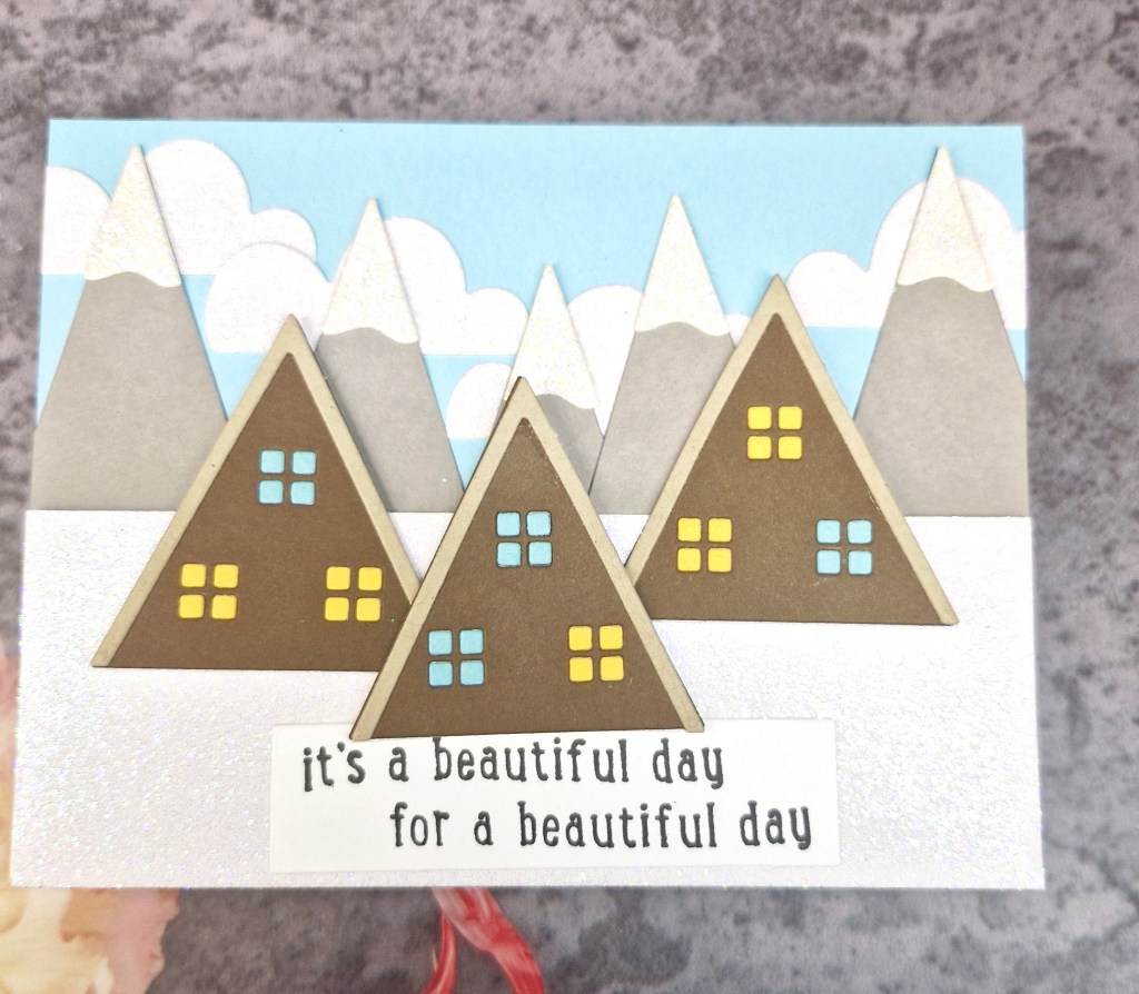 The layers were all added, attaching the cabins and mountains as you see, before stamping and adding the sentiment.
