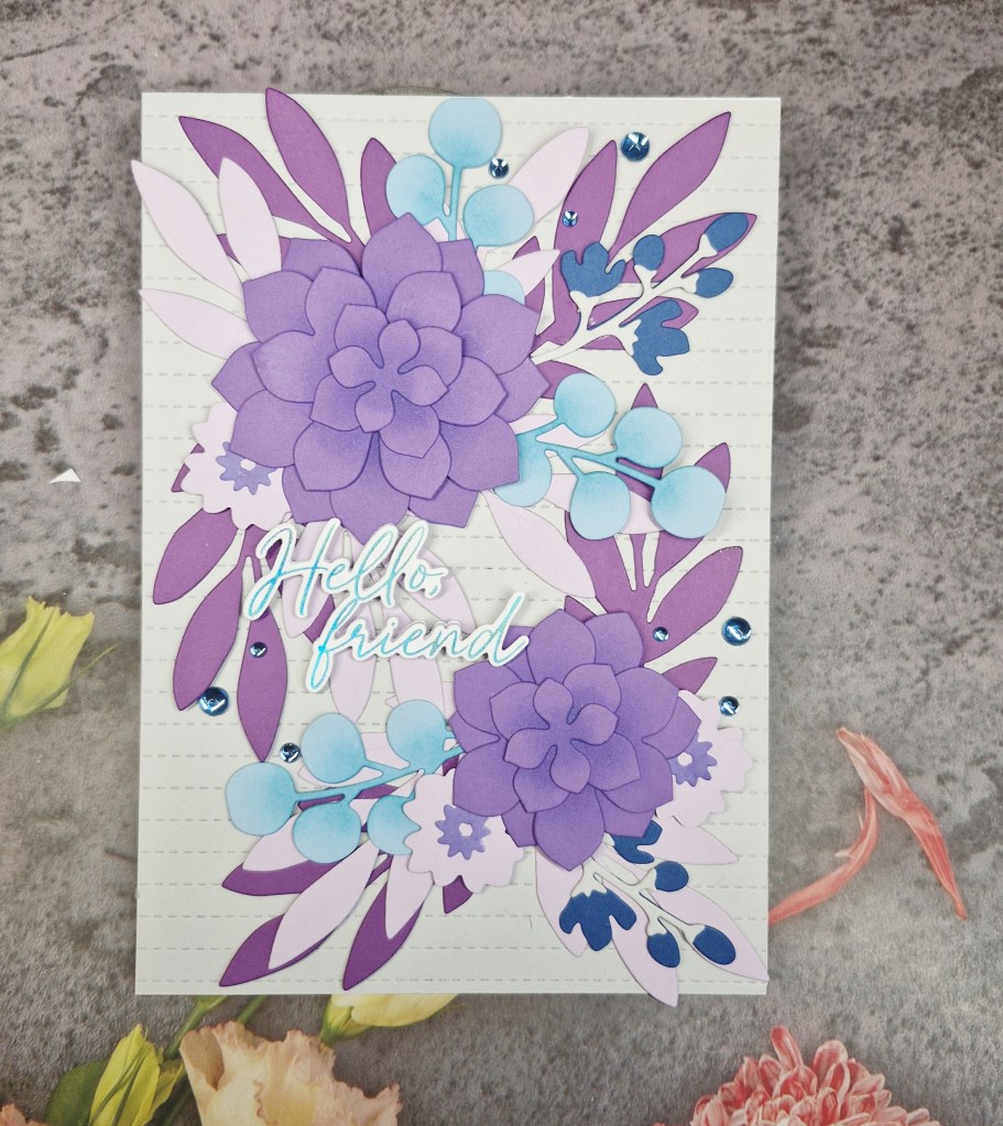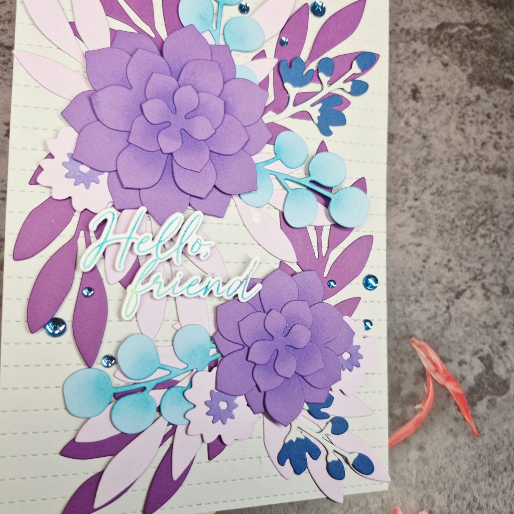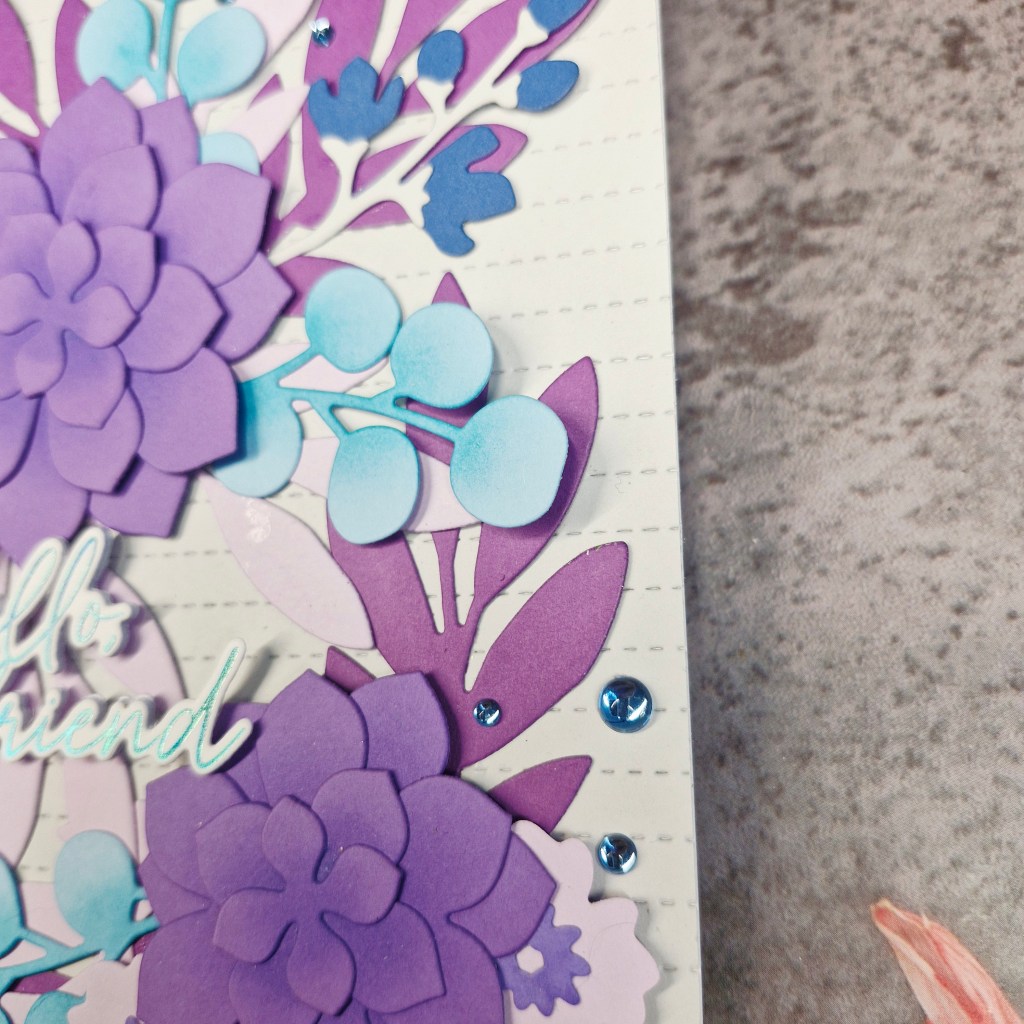 I ink blended the larger flowers a little in the centre of each layer then glued them together. I did the same with the light blue die cuts – just a little extra interest.