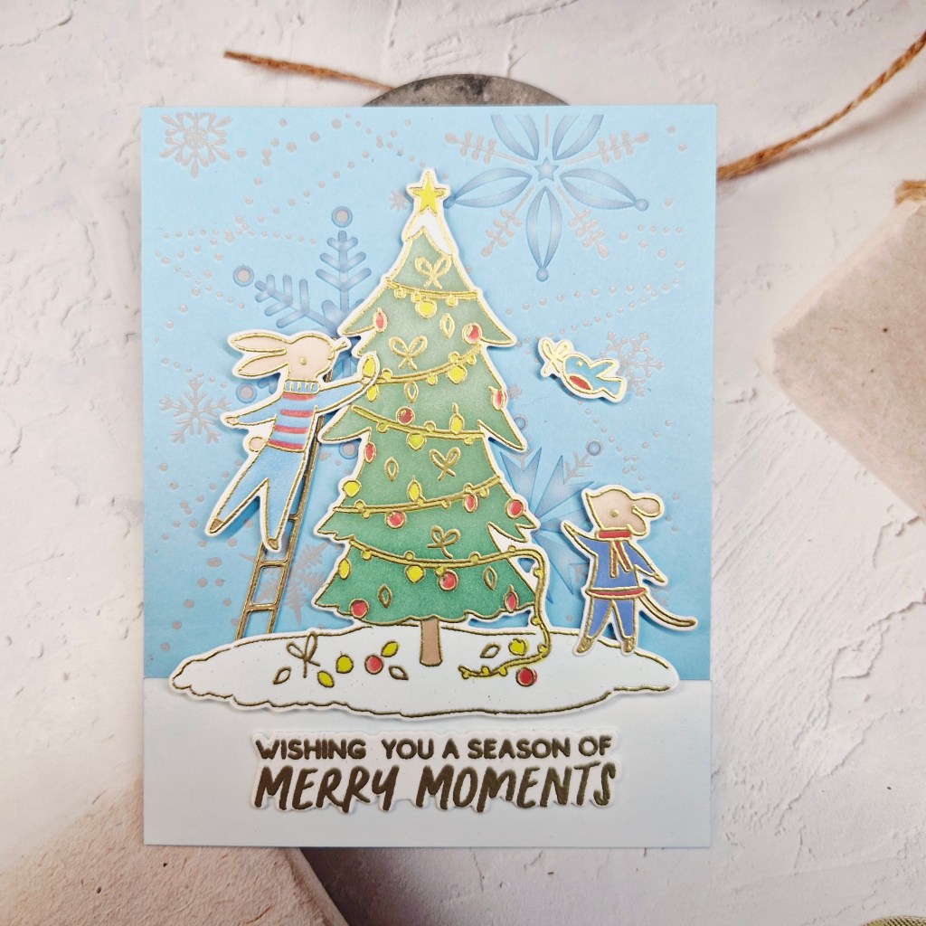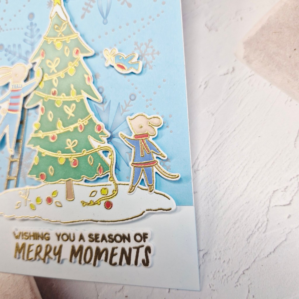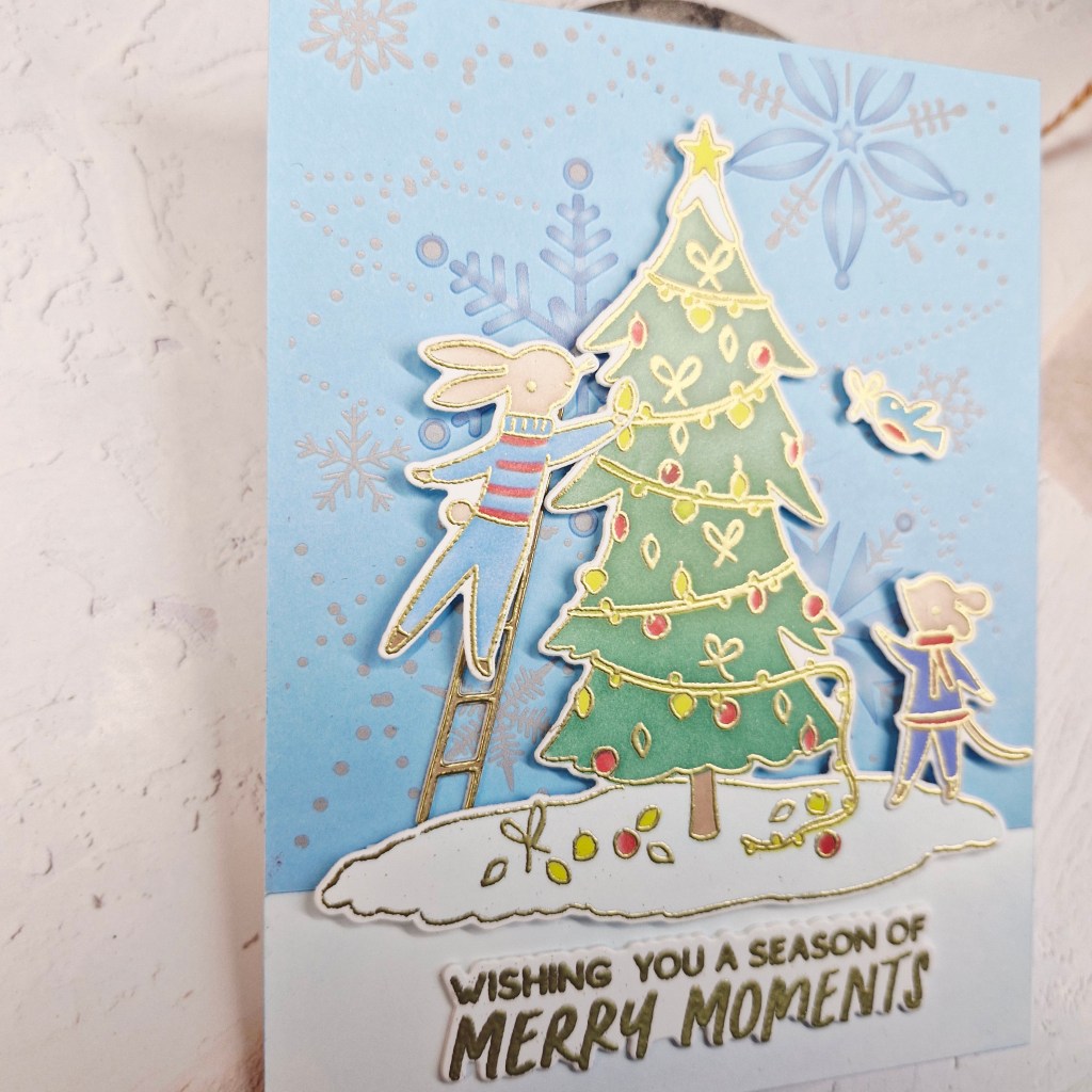 The blue and white panel were glued down to a white card base, and the tree adhered with 3D foam, as were the critters – but the ladder was glued flat, but was layered a couple of times for stability.