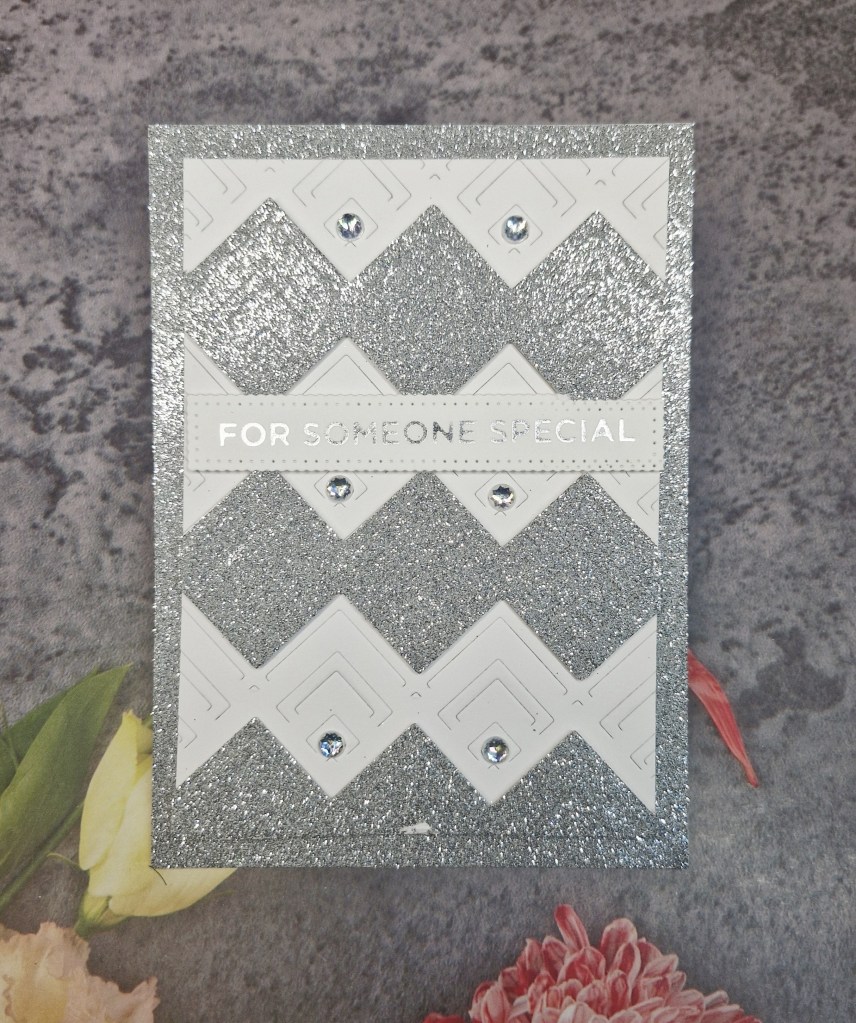For this I used a new product from Waffle Flower Crafts – the ‘Happy Chevrons’ die. I first cut it out of white card, then silver glitter card, snipping the two edges so I could alternate the white with the silver.