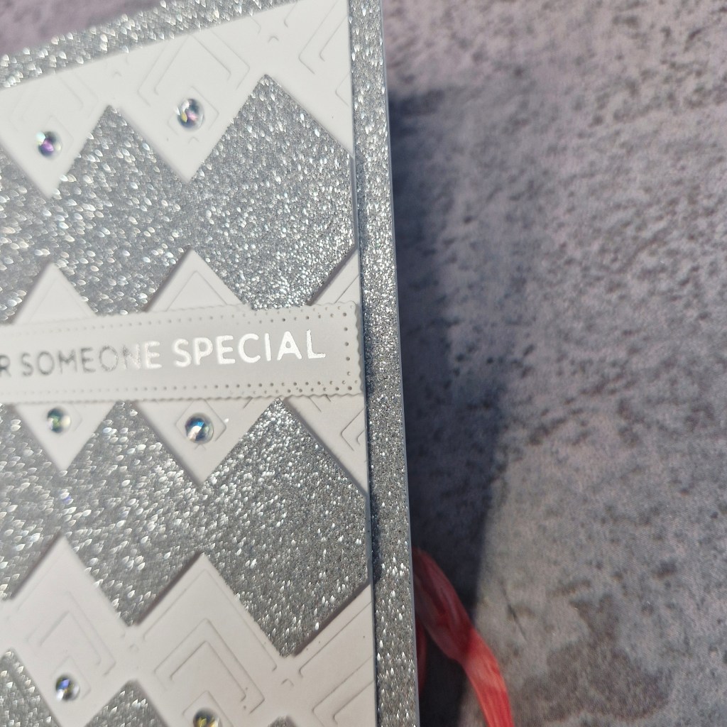This was then layered with another piece of silver glitter card, then attached to a card base, the gems added, and then the foiled sentiment.