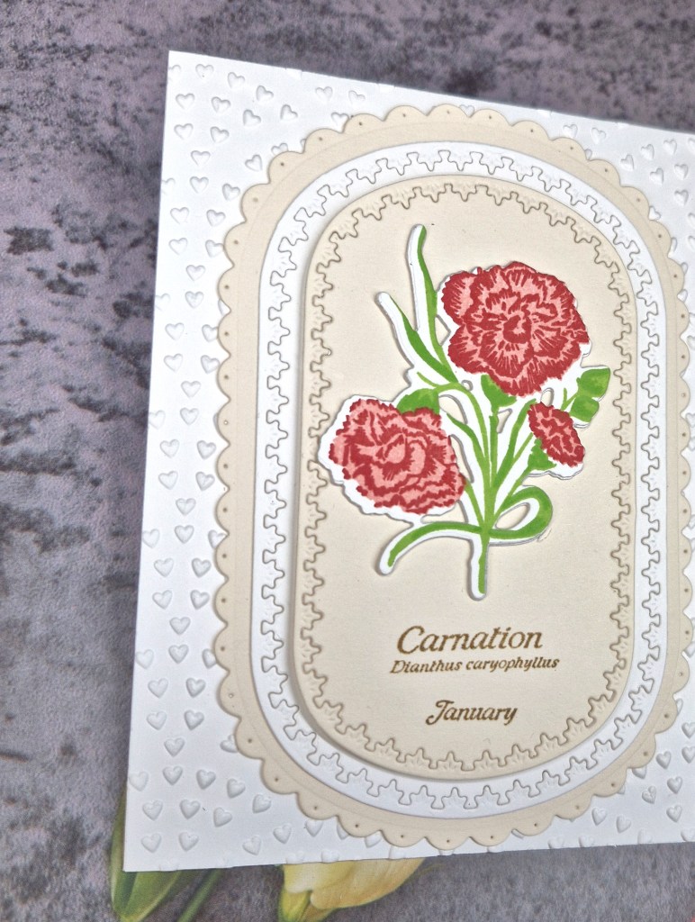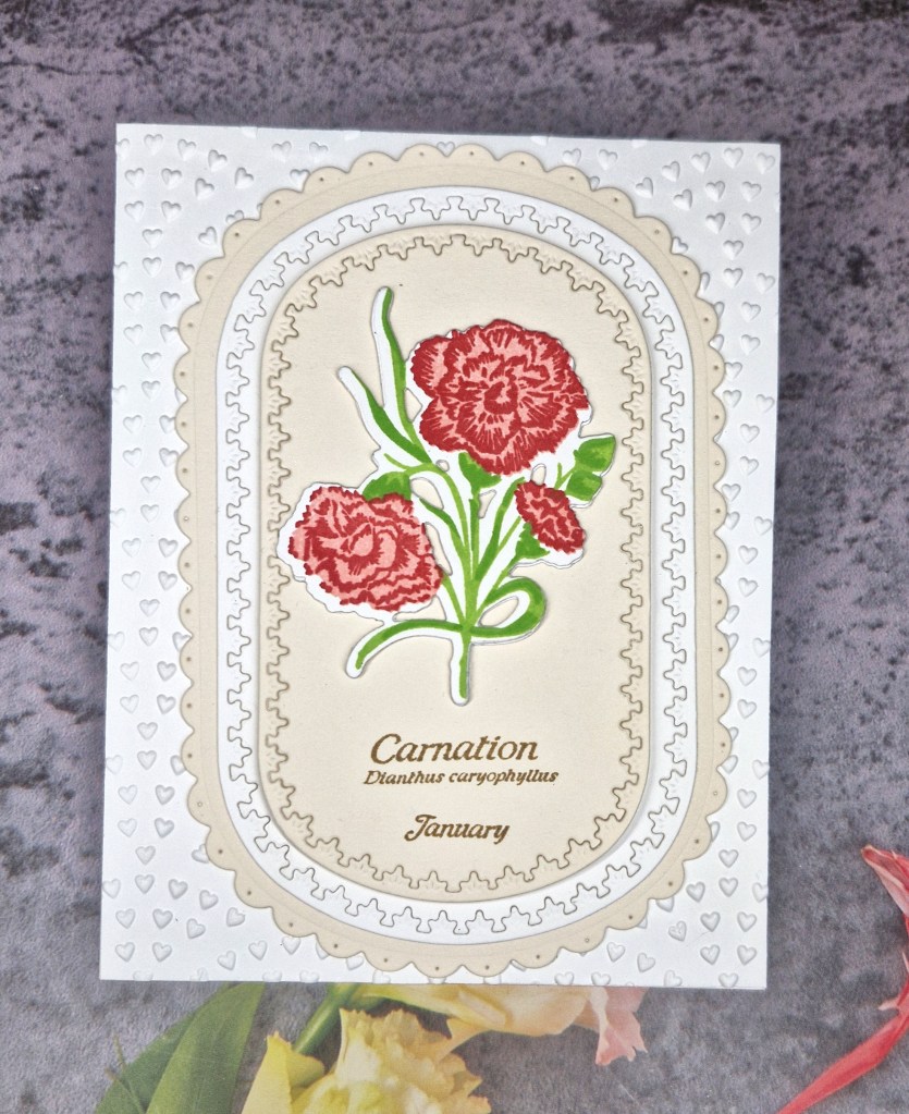 The main floral image is from The Greetery, a layering stamp of a carnation, then die cut with the matching die.