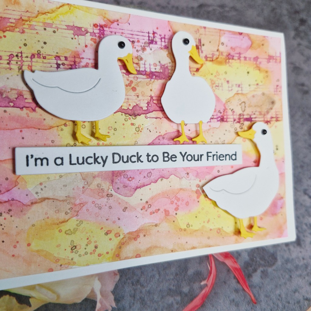 This was drying to one side, and I die cut the ducks from a Simon says Stamp set, layering them together and adding small black gems for their eyes.