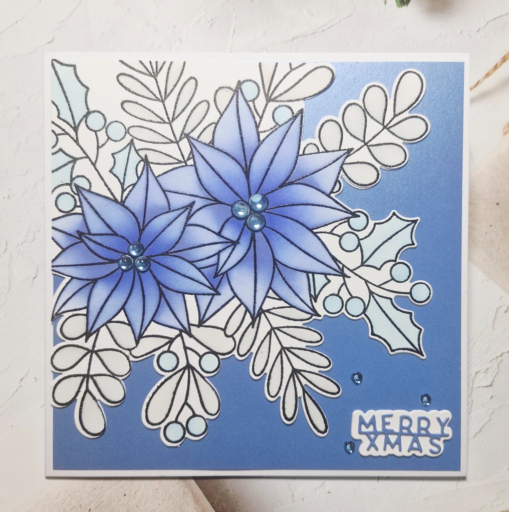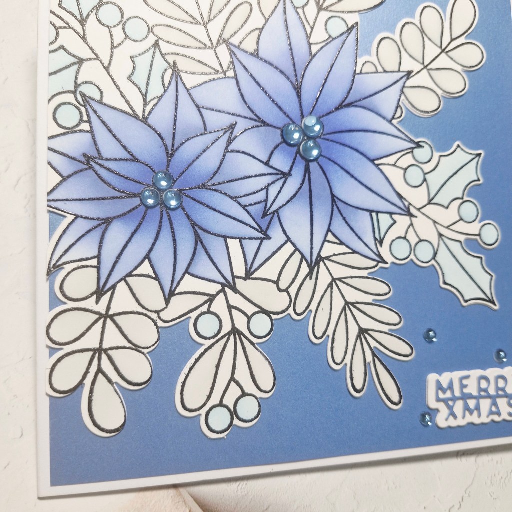 The foliage was ink blended using a light grey ink, and a lighter blue for the holly leaves and berries.