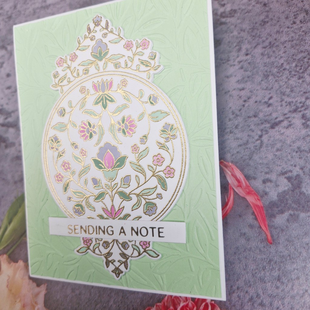 The centre image is from Pinkfresh Studio ‘Garden Tapestry’ and consists of a stamp, die, stencil, and hot foil plate. I didn’t use the hot foil plate this time round, and chose the stamp and gold heat emboss the main image.