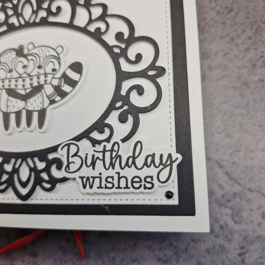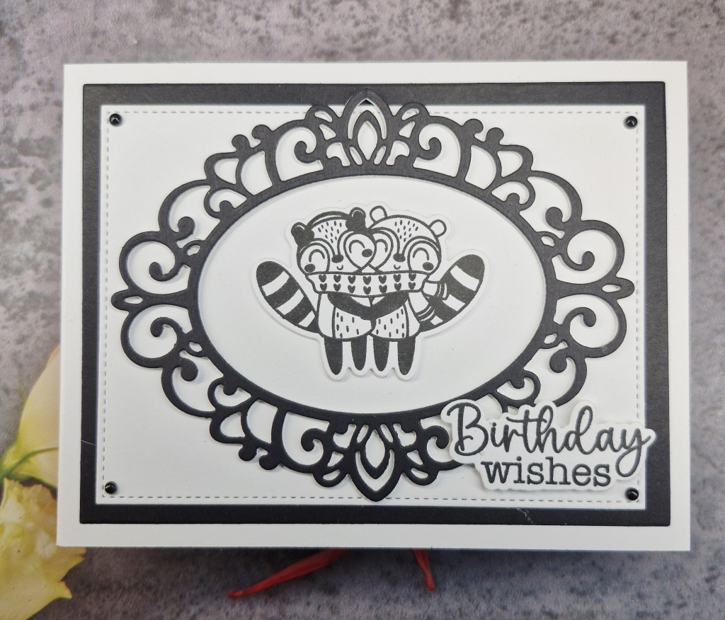 When I first saw the theme, I remembered this stamp set from Gina K Designs and their 12 Days of Christmas box. The stamp and matching die set is called ‘A Paper Hug‘ and as there were racoons on there, and I wanted a purely black and white card, I thought they would be perfect.