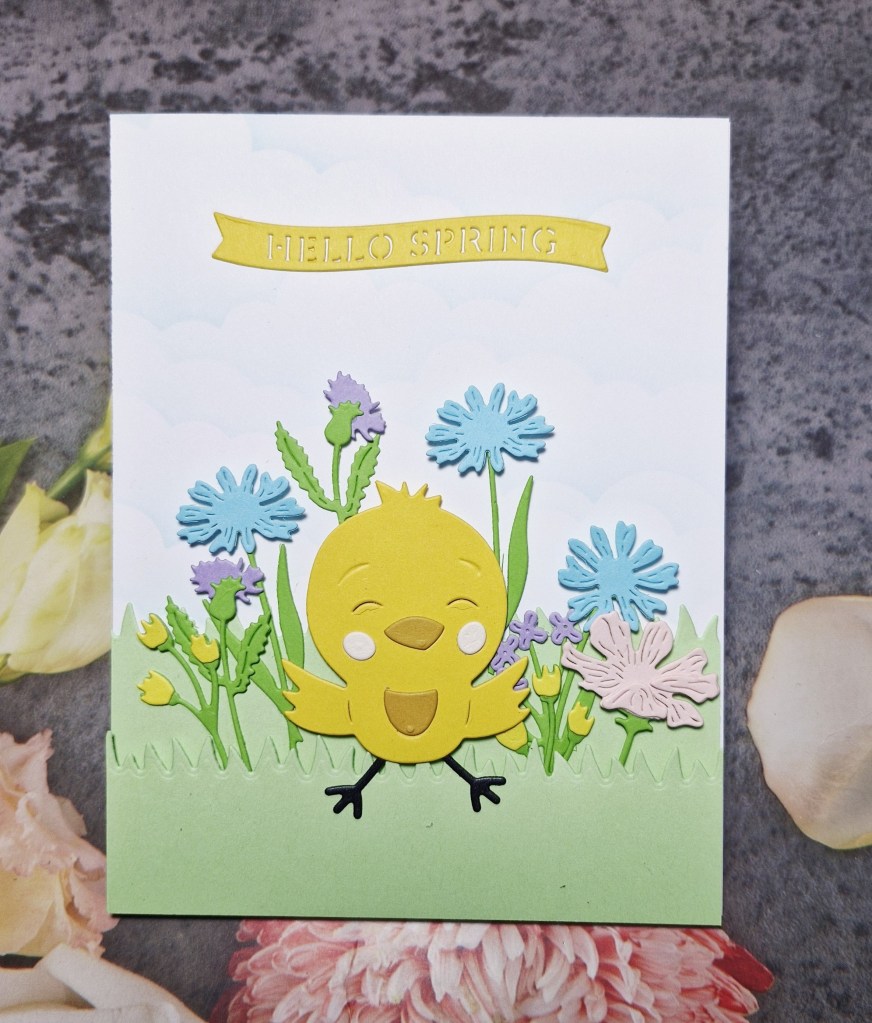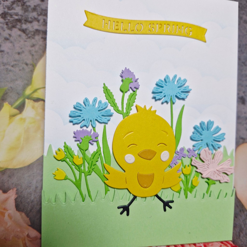 The flowers were added, tucking them into the bottom grass layer, the chick attached with 3D foam, then the Spellbinders sentiment die cut and attached.