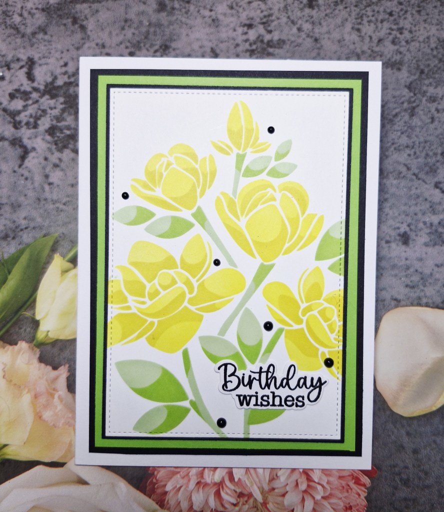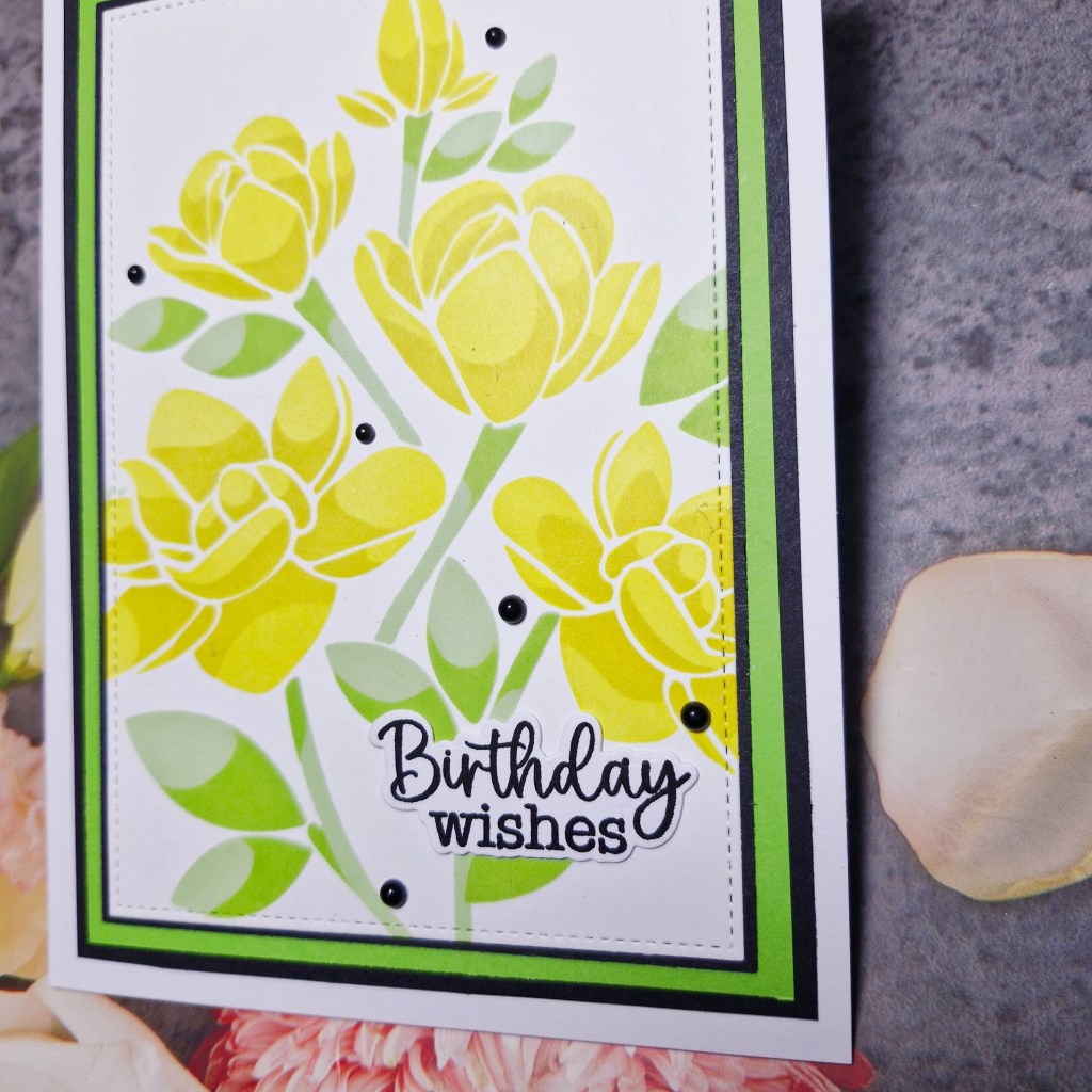 The layering stencil is 6 x 6 inches, and I ink blended onto a square piece of white card stock using Pinkfresh Studio inks. Once blended. I used a Master Layouts die to cut out the are I wanted, then matted with black and green card stock, before adhering to a card base.