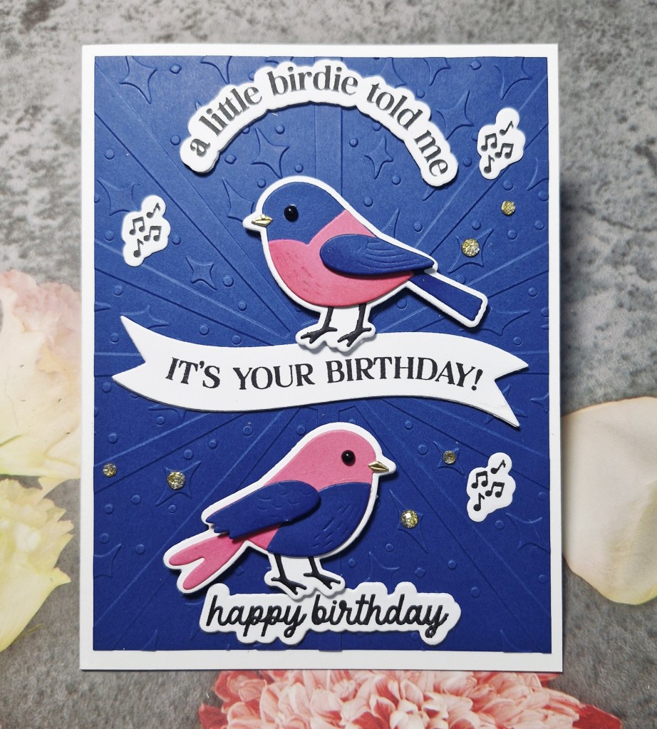 The birds were die cut with white for the base of each, and then navy and fuchsia card stock for the layers. The blue and pink pieces were ink blended a little to create some dimension, then the layers glued together. The wings were added with a small piece of 3D foam, the beaks were die cut from gold card stock, and the eyes are little black gems.