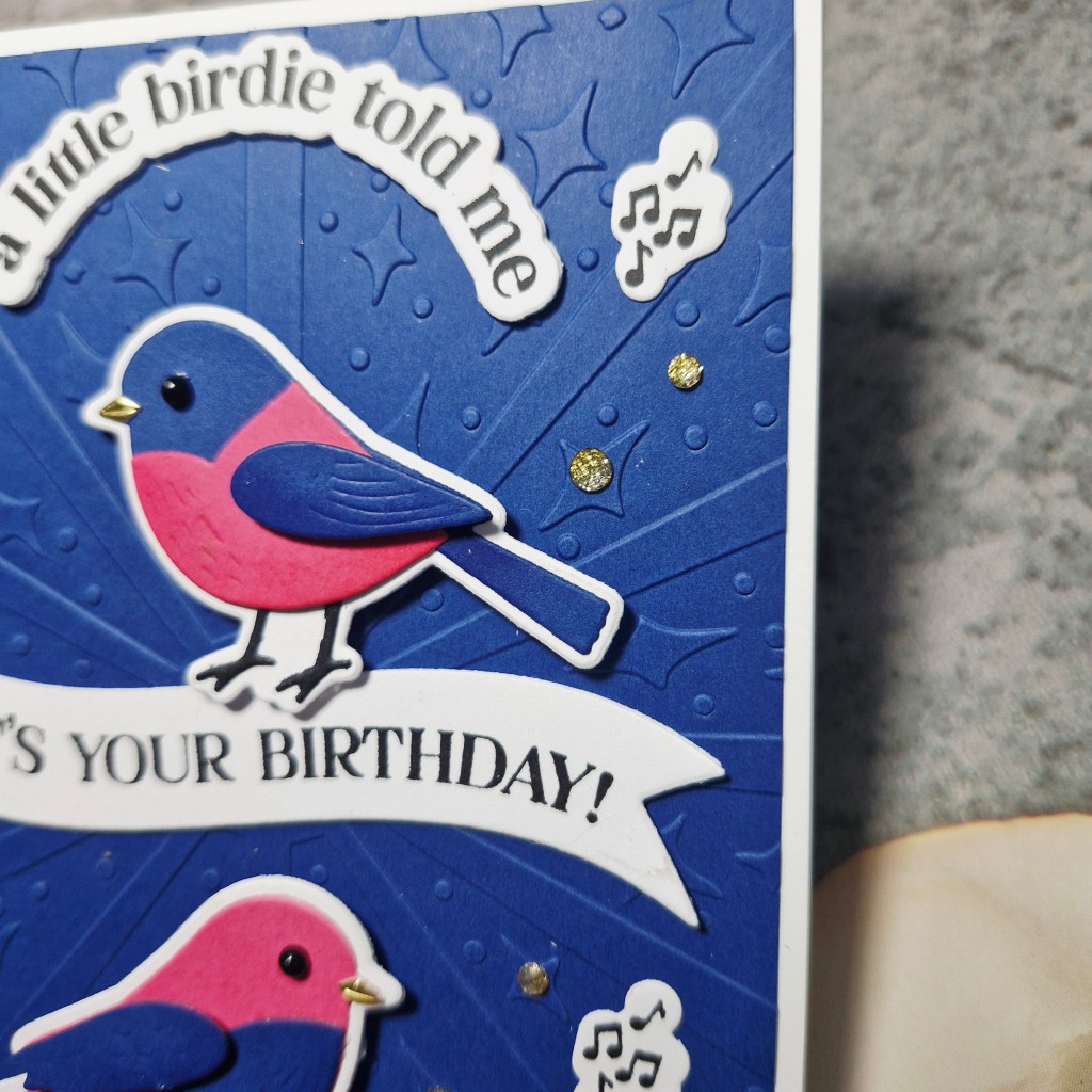 To put this together, I added the sentiments first, then attached the two birds with 3D foam, making it look as though they were perched on the sentiments. The musical notes were glued flat to the card panel, and some ombre gold gems added – from Pinkfresh Studio to tie in with the gold beaks – and because I love to use them….. :)