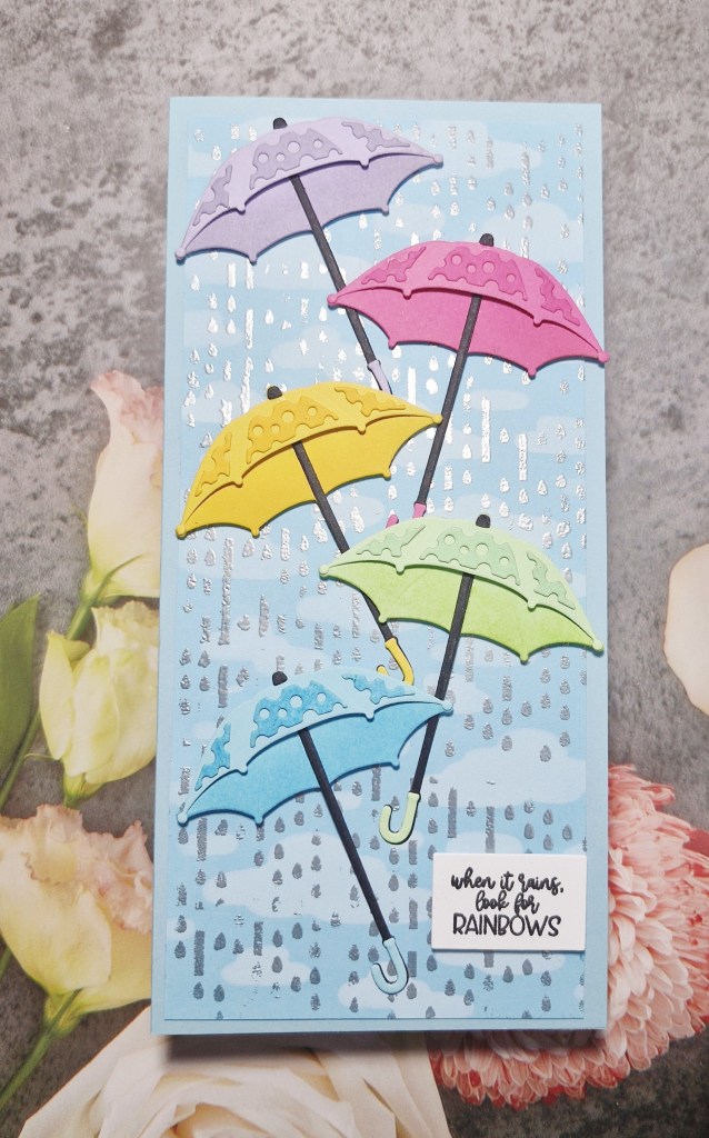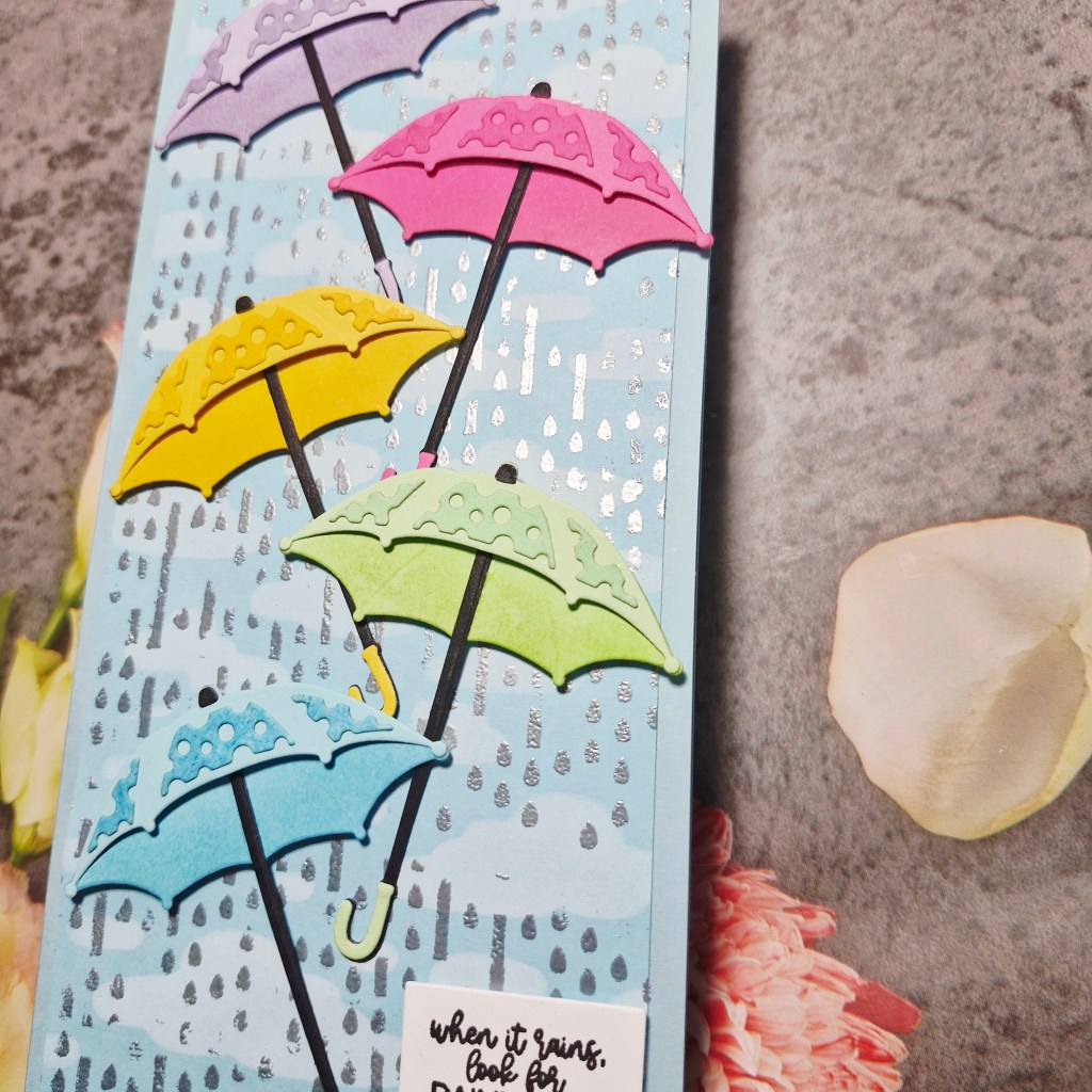 The rainbow umbrellas were created using a Spellbinders die set, ink blending a slightly darker colour for the under-side of each umbrella, and adding the lacy layer – ink blended to be slightly darker – for a little more interest and dimension.