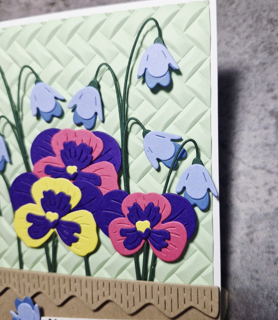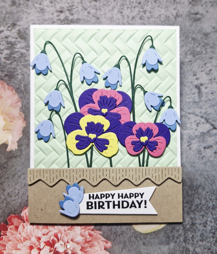 There are a couple of challenges calling for Spring themed cards, so I used the new dies from Spellbinders which included these bluebells and pansies, and some bright card stock off-cuts I have handy.