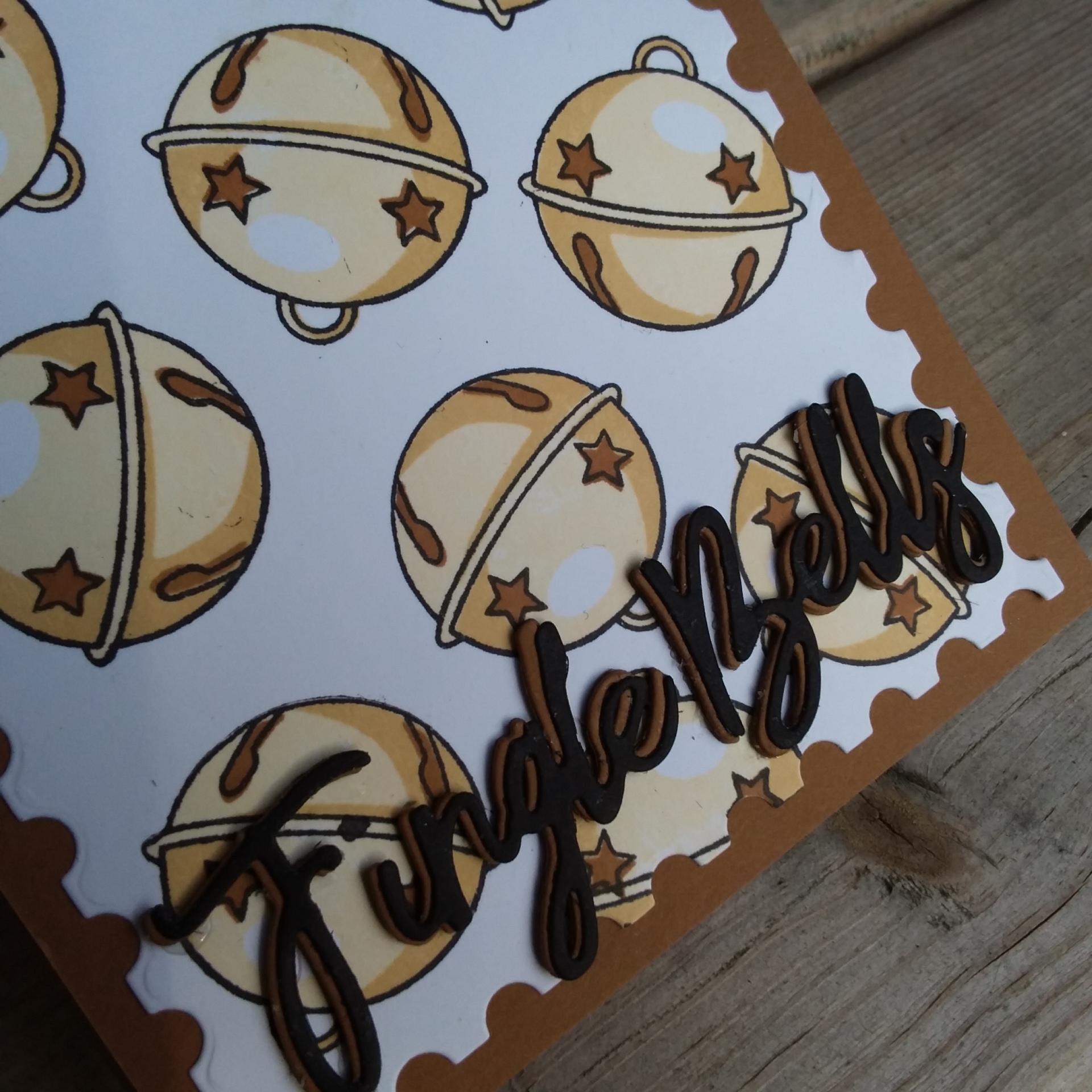 I then took the jingle bells word dies from X-cut, and cut them out several times with a brown card stock, then matted a black layer on top, slightly off-set, to give some dimension and shadow – but the shadow being brown this time: