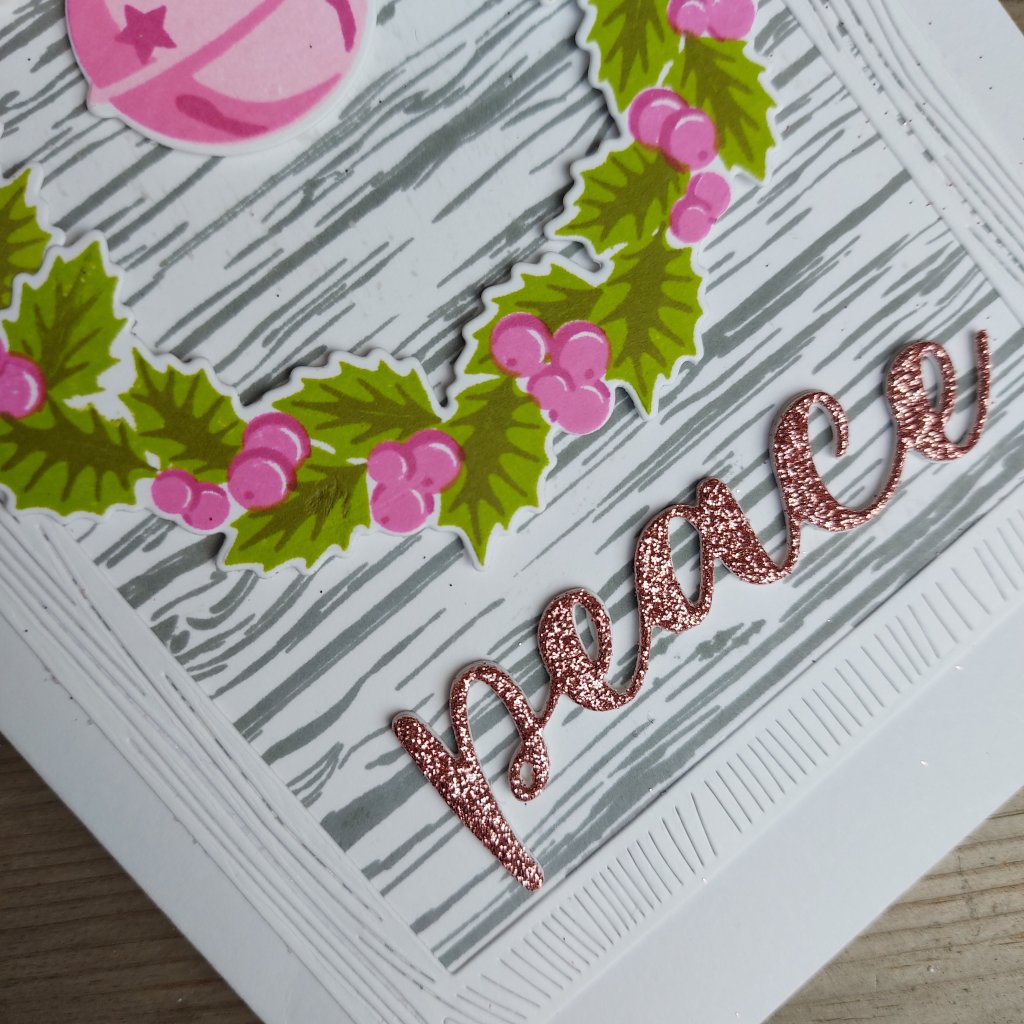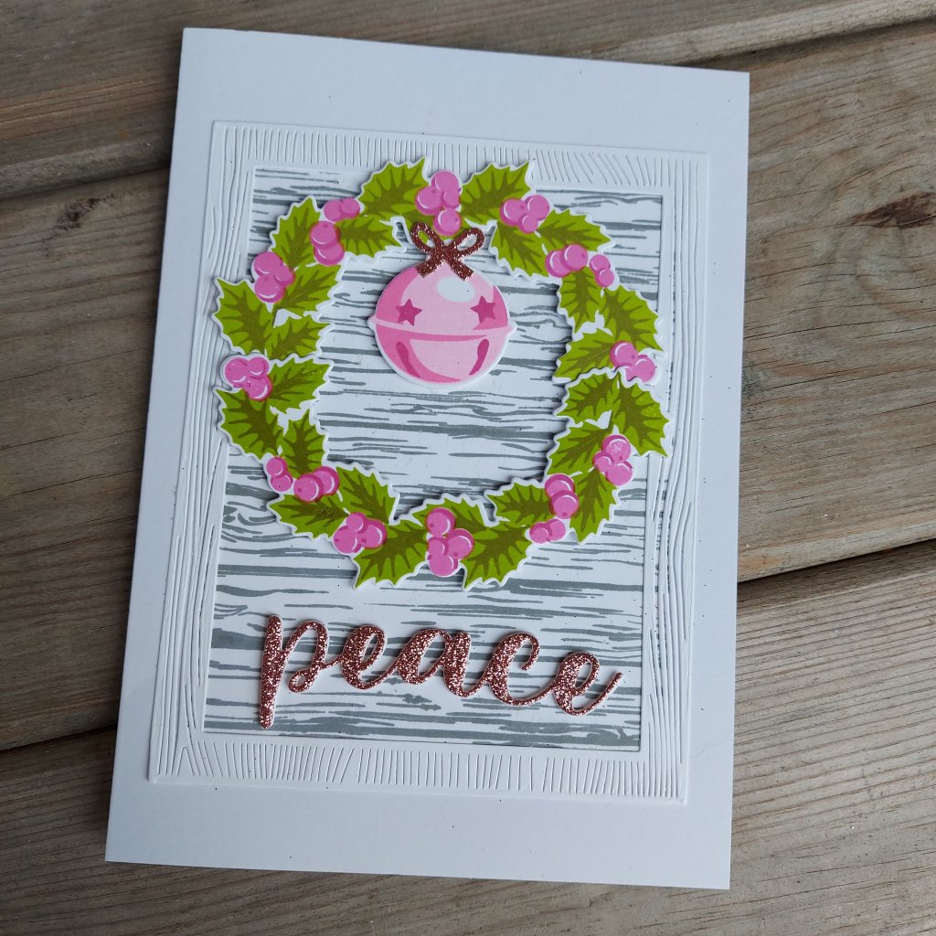 Using Altenew ‘Bells and Bows’ to create the hanging bell, and ‘Peaceful Wreath‘, on the background of the ‘Pallet Background’ stamp. The word ‘peace’ die cut several times and the last layer being some pink glimmer card from Stampin Up, with ‘Infinity Wood Frame‘ dies from Hero Arts.
