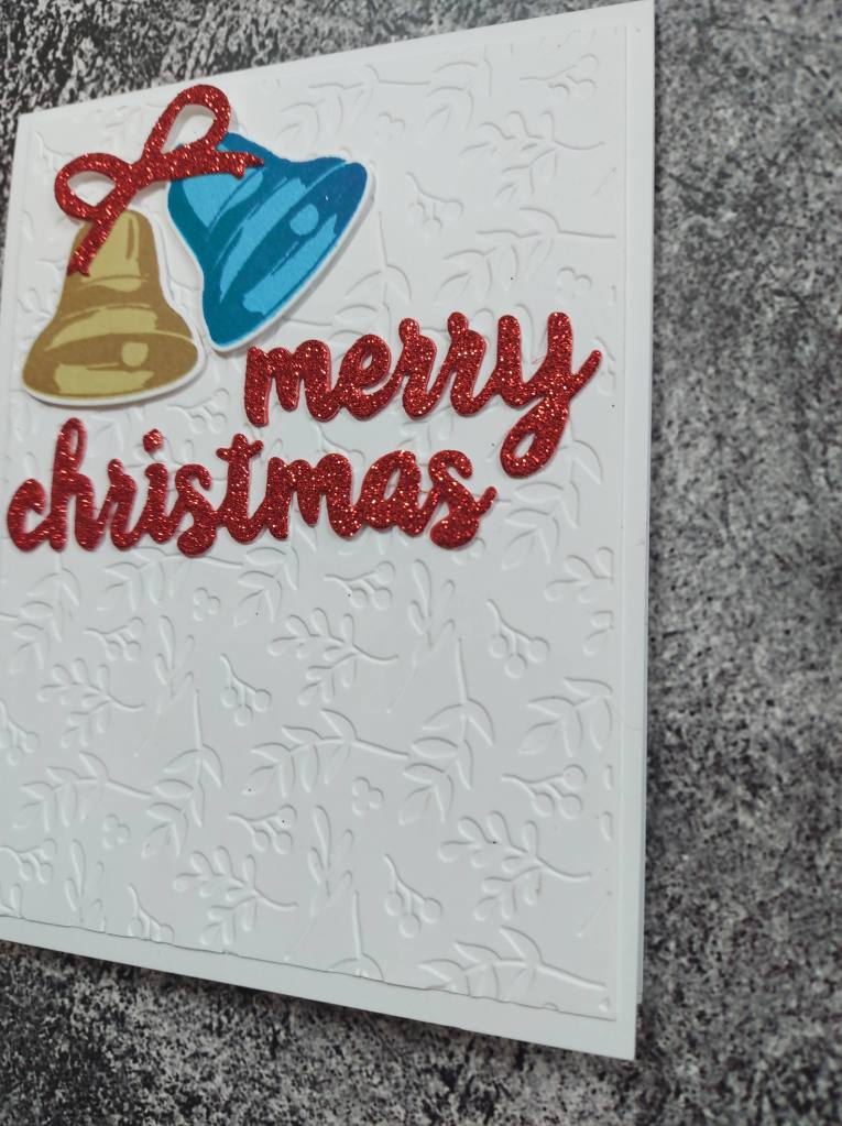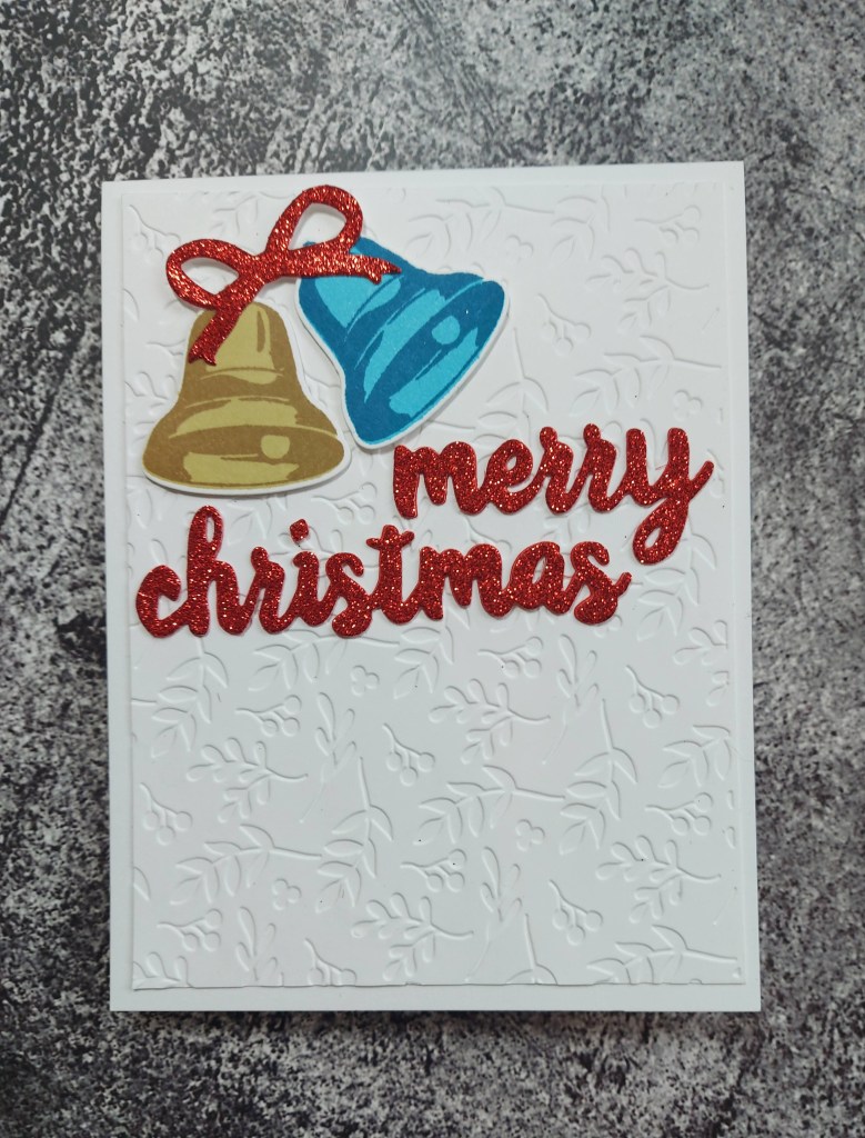 The bells are from Altenew, stamped using their inks, and the bow and sentiment were die cut from red glitter card stock.