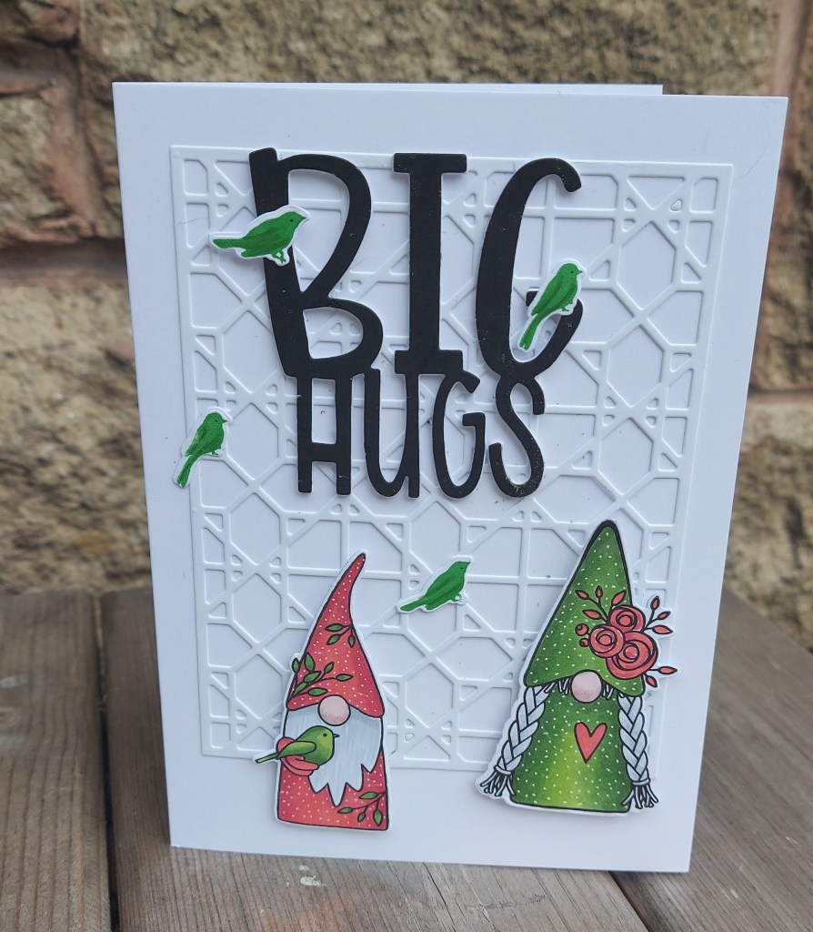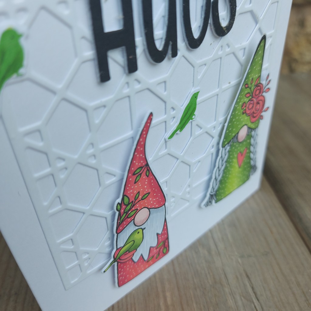 I used two gnomes from Simon Says Stamp ‘Spring Gnomes‘, stamped in Gina K amalgam ink, coloured with Copics, then used the matching die set to cut them out. White gel pen dots were added for extra interest.
