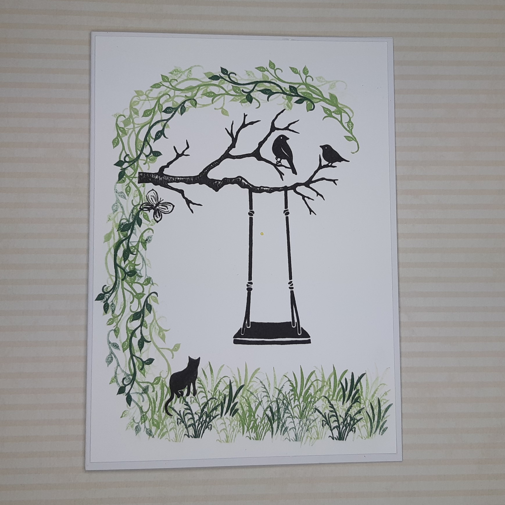 I first stamped the tree branch, swing, birds, and cat in black, then took another vine stamp and used three of the Altenew inks, using second and third generation stamping too, to create a frame.