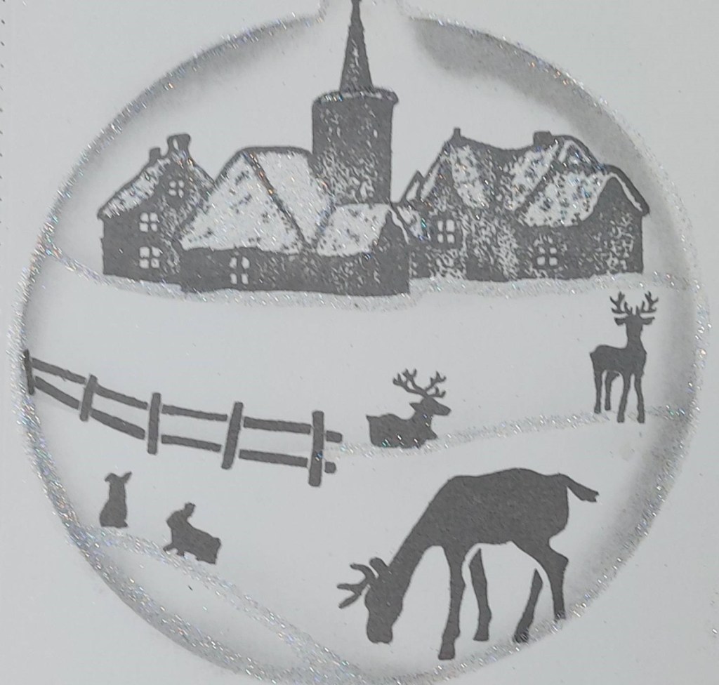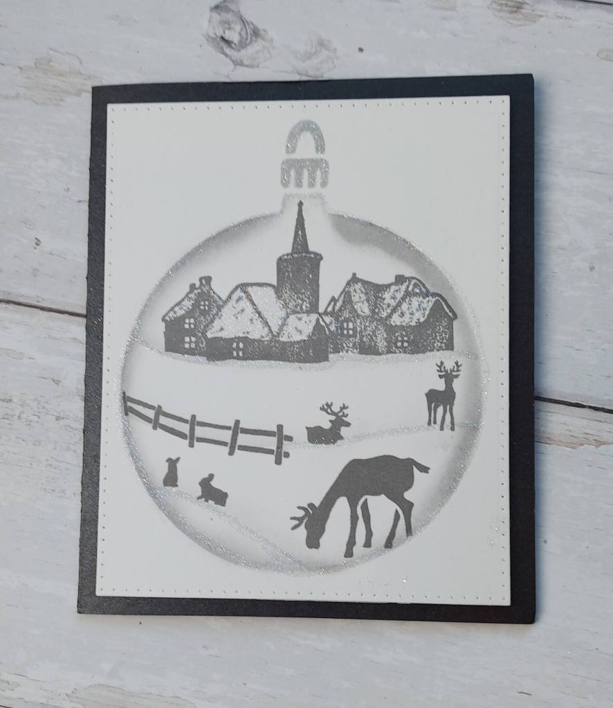 I began with a piece of Bristol Smooth card stock, then placed the Card-io Bauble stencil onto it. I stamped the little scene at the top with Distress Oxide ‘Weathered Wood‘, then placed the fence and animals where I thought they could sit.