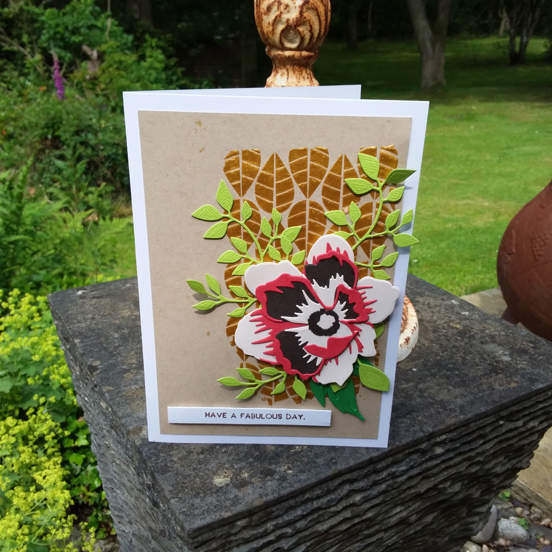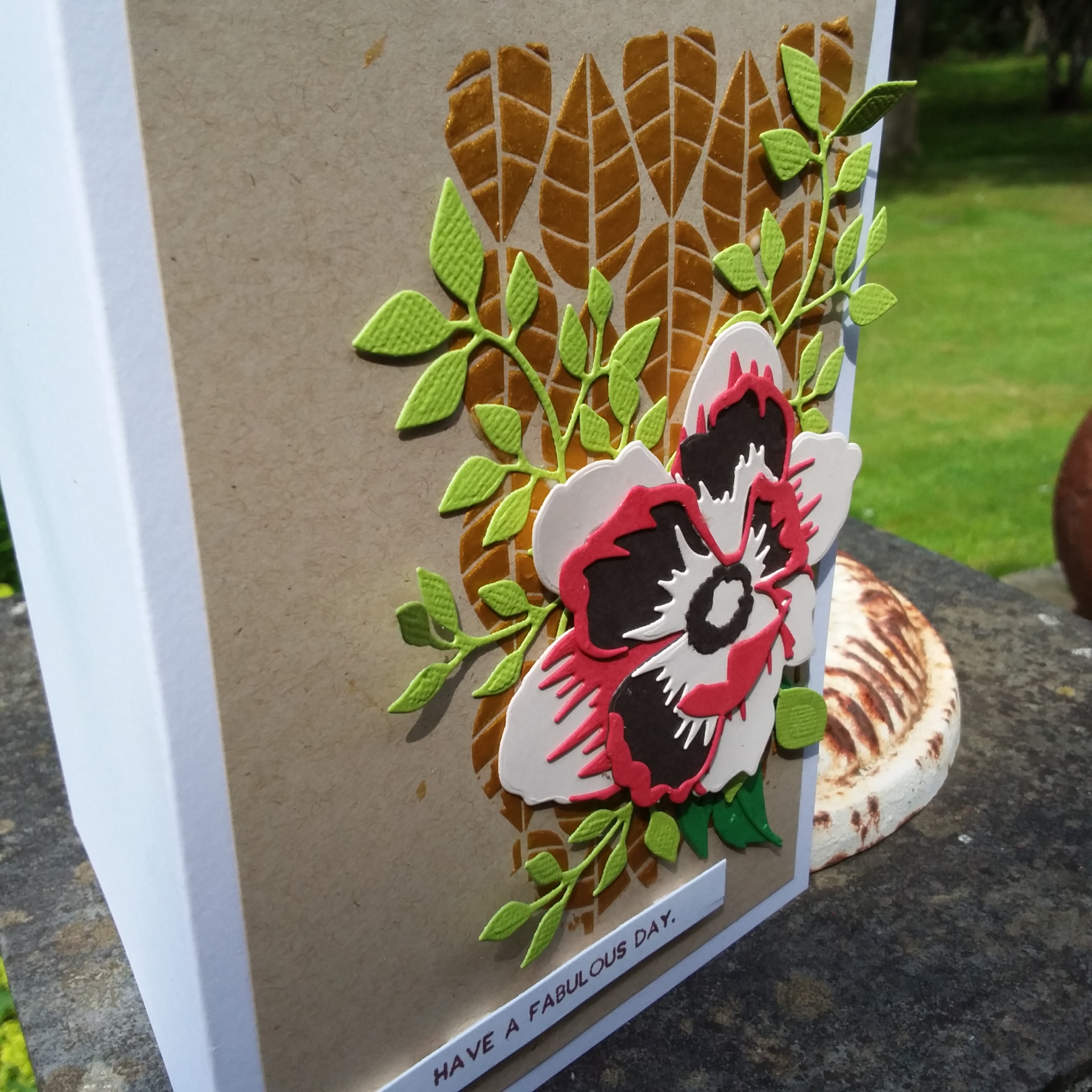 For this card I used an older stamp, stencil and die set from Catherine Pooler. I first used an oval stencil on a white card base, then placed a piece of masking paper across the bottom to create the straight line, then added the leaves stencil on top of all that.