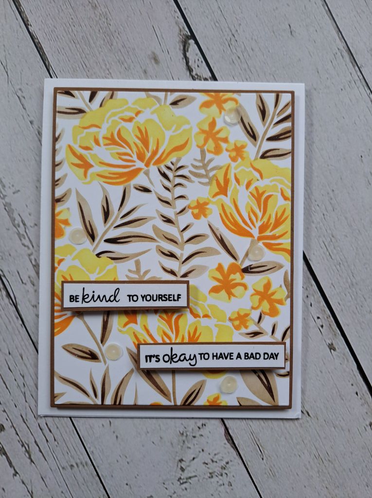 I used Gina K Master layout dies to create the floral layer and the Kraft layer, attached with 3D foam, and also added some of the same kraft behind each sentiment strip to make them stand out more against the background.