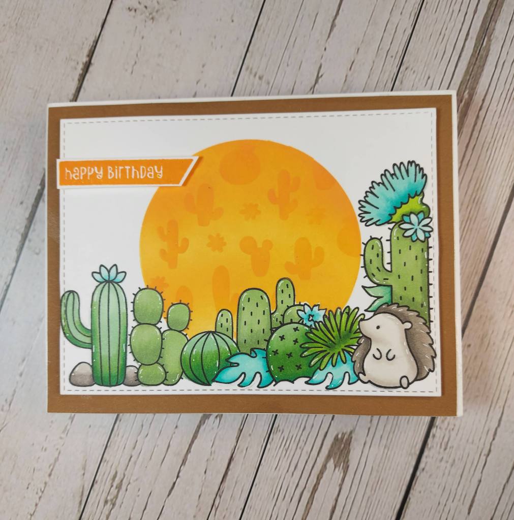The white layer was first stamped using the hedgehog corner on the right side, masked off, and then a row of cacti stamped along the bottom. This row was also masked off, and a circle stencil – die cut out of mylar – used to create the orange sky.