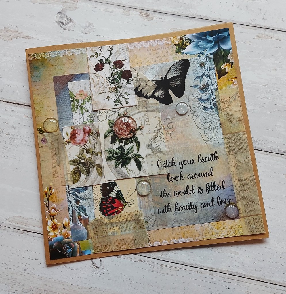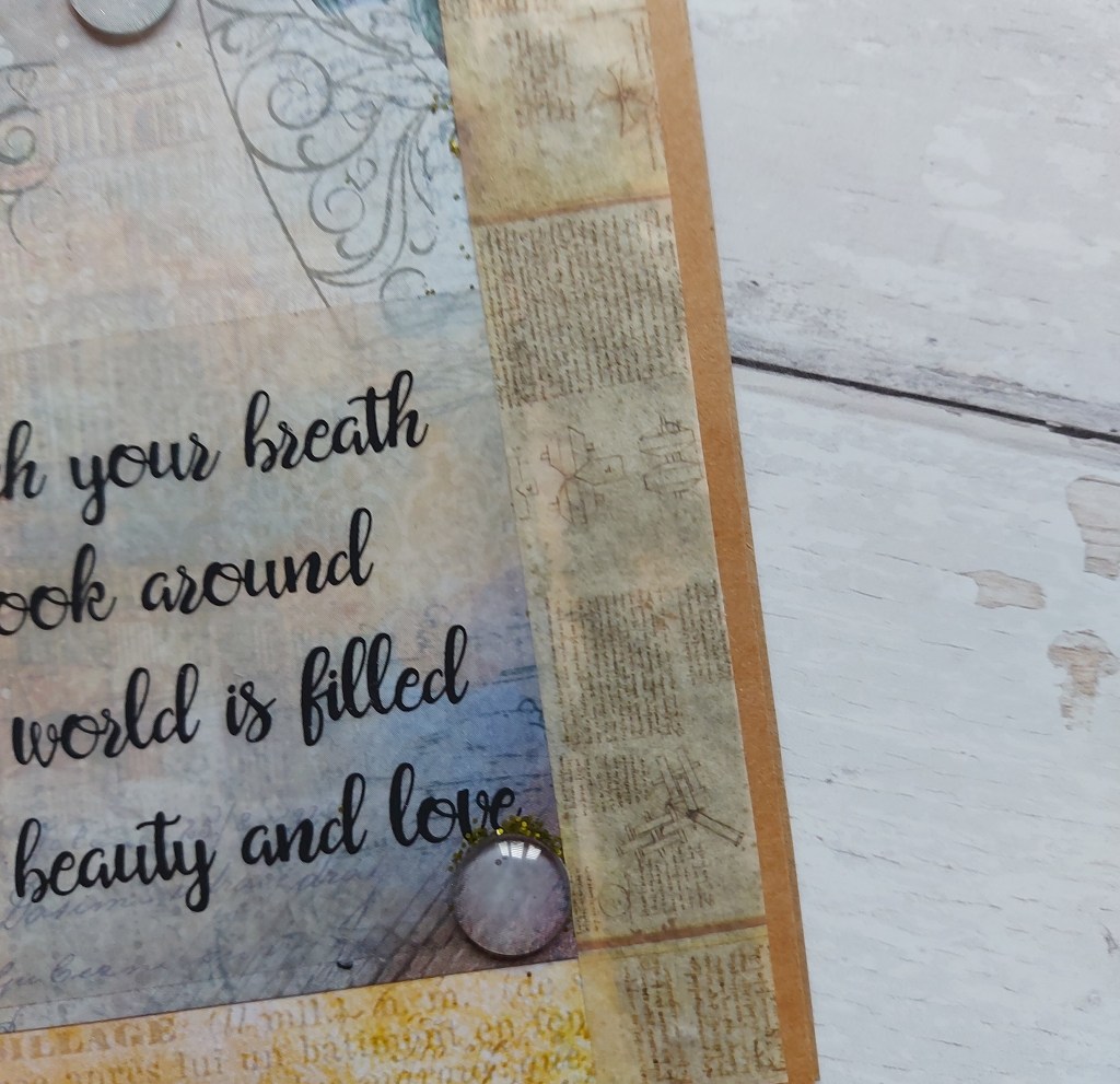 I took inspiration from several challenges, gathered some stuff together, and set to gluing and sticking and layering and……well – here it is: