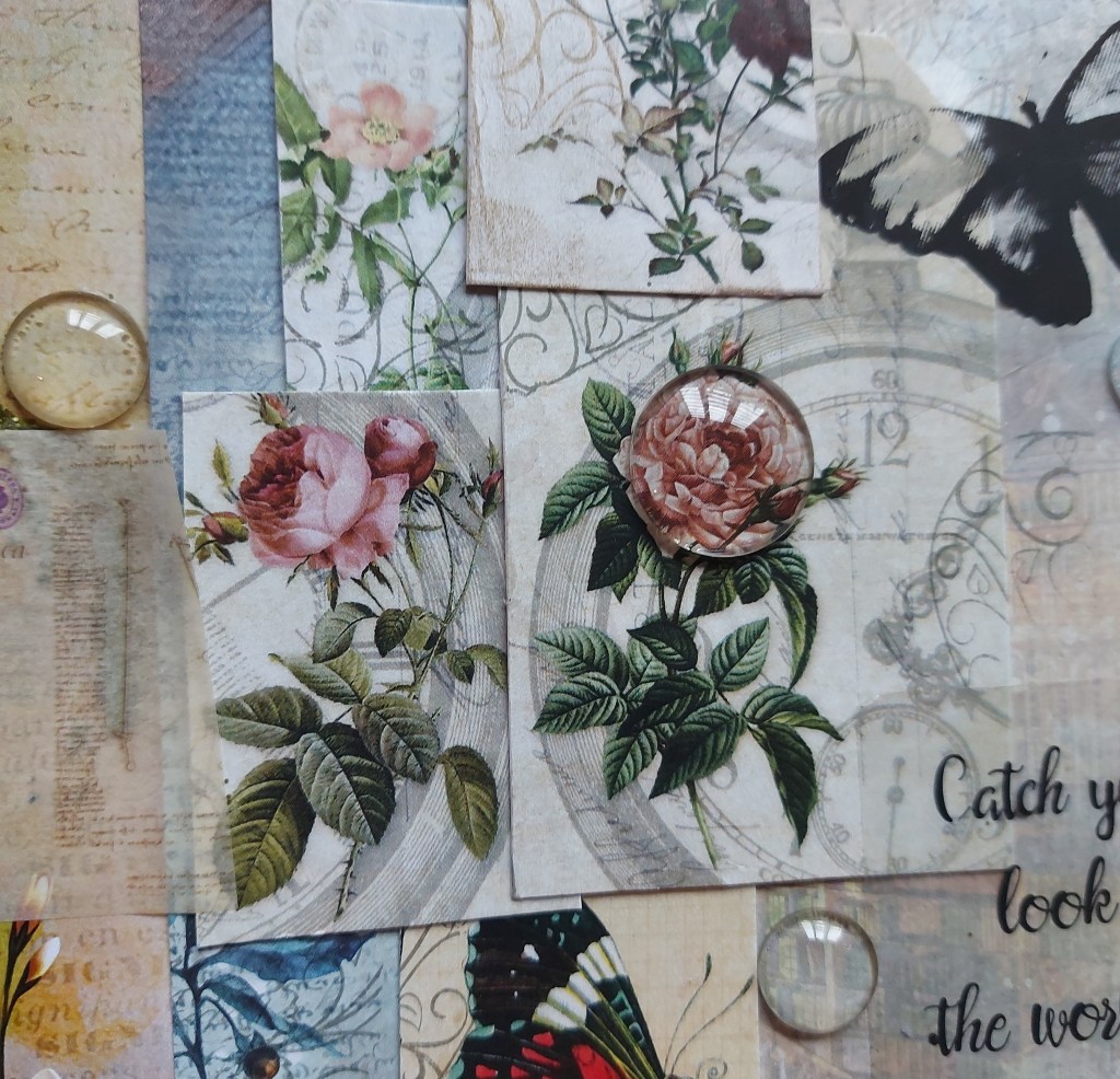 I found some glass domes and added some of them and laid one over a flower image to give some more dimension to the colour.