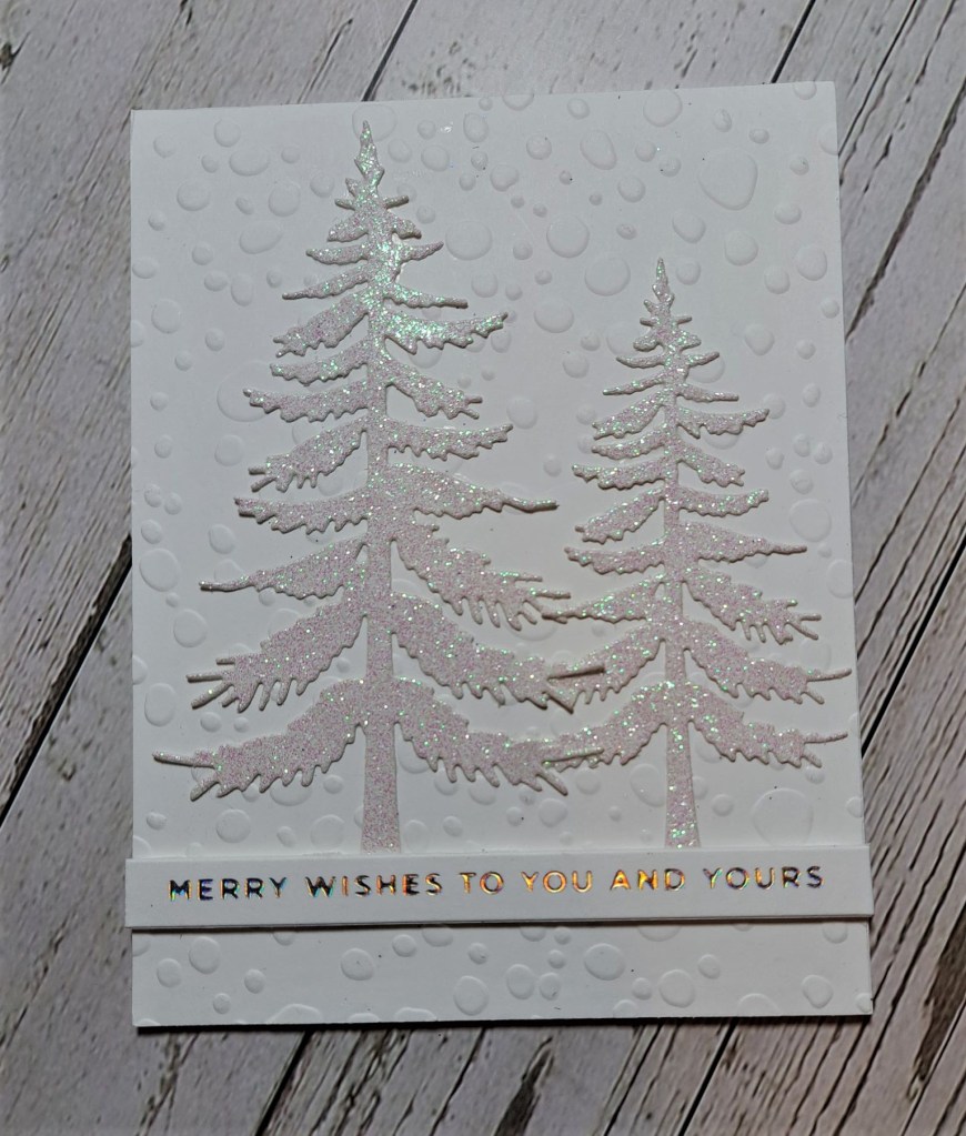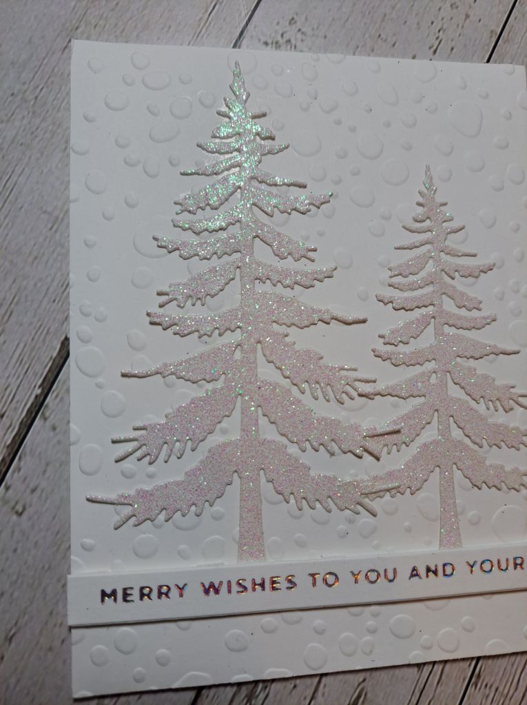 The sentiment is a debossed sentiment from Spellbinders, but to make the words actually cut through the navy blue card, I used a shim to create more pressure – to make it cut through, and not just deboss. A white panel behind to make it stand out more.