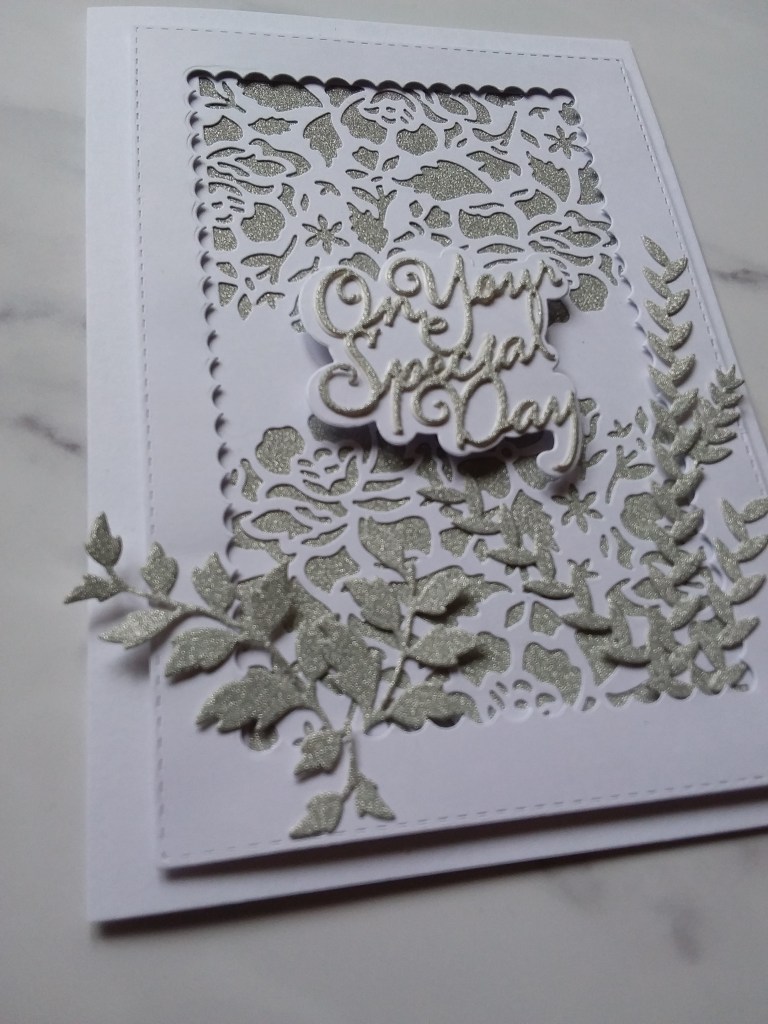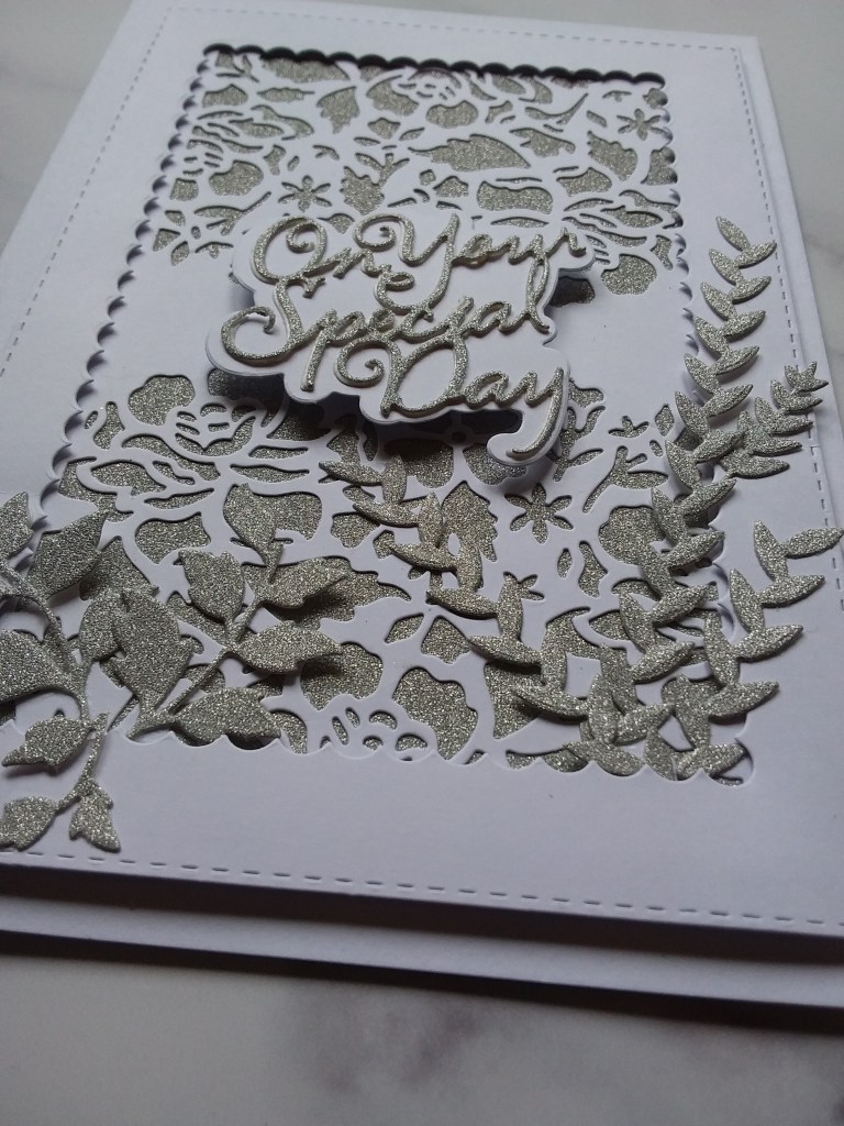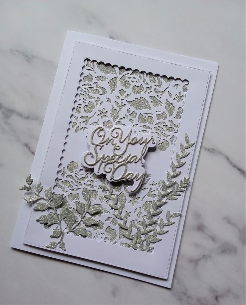 I dry embossed a piece of white card stock with a Simon Says Stamp embossing folder – but used the deboss side instead of the embossed side.