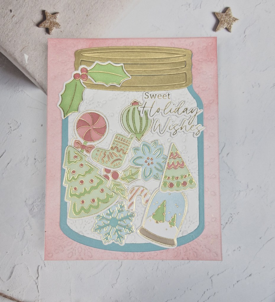 All of the images were hot foiled in gold, then coloured using the matching layering stencils, die cut with the matching die, then arranged onto/into the jar.