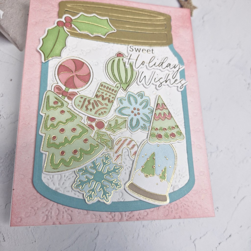 The jar was created first by die cutting the back of the jar in a light teal card stock, then die cutting the inner white piece. This piece was dry embossed using a snowflake cover panel for added interest, glued to the base, then the lid was die cut from brushed gold card stock from Spellbinders.