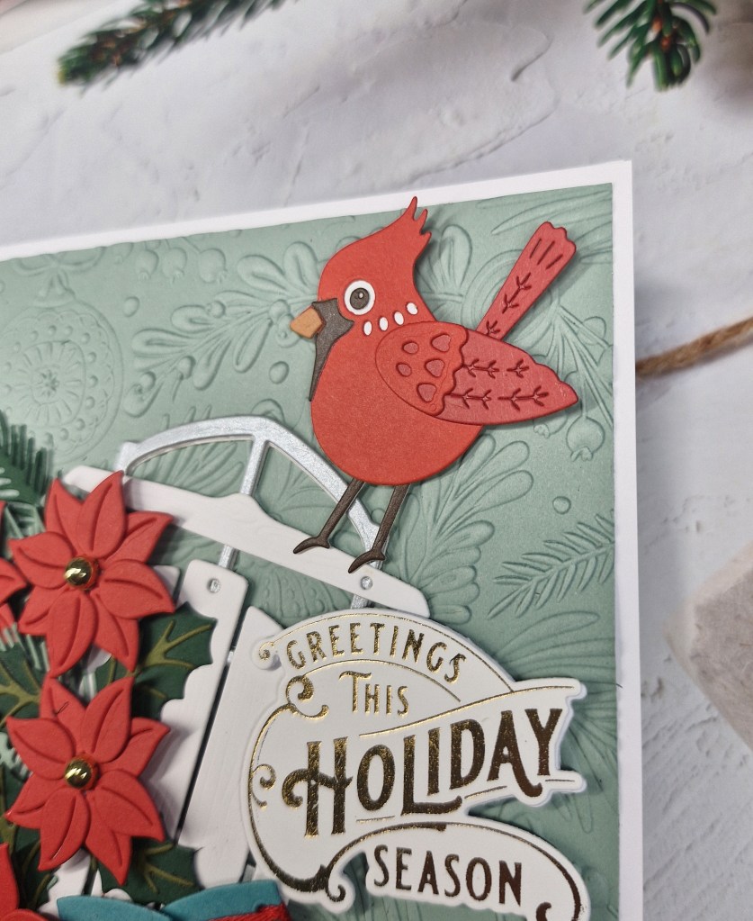 The sled was die cut in silver and white, then glued together, before turning to the flowers, foliage and the bird.
