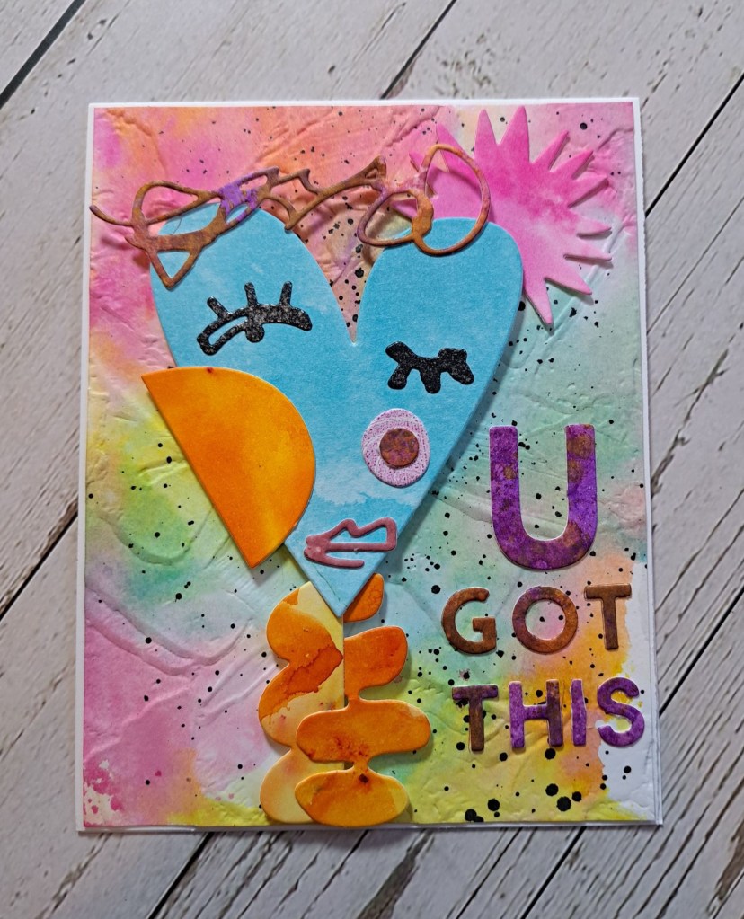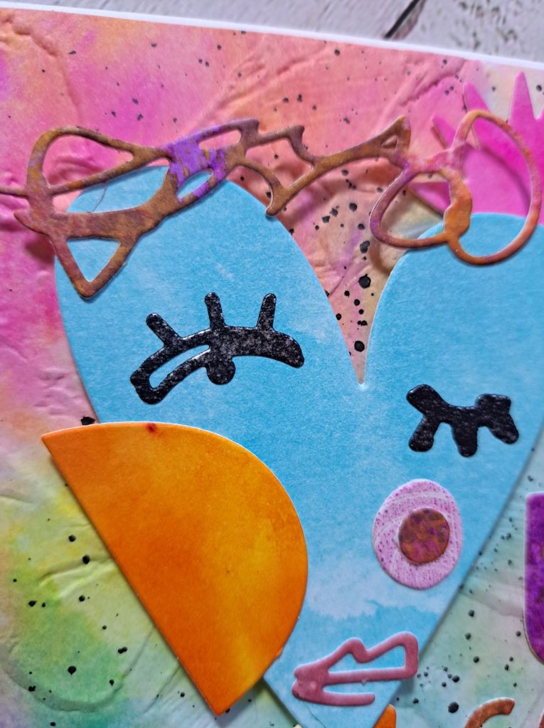 I glued four of the die cuts to the base, added sequins into the ‘well’, added acetate to the back of the top ink smooshed layer and stuck down. I wanted a brown-ish coffee cup, but not solid brown. The lid was die cut and added.
