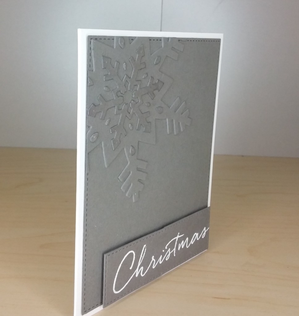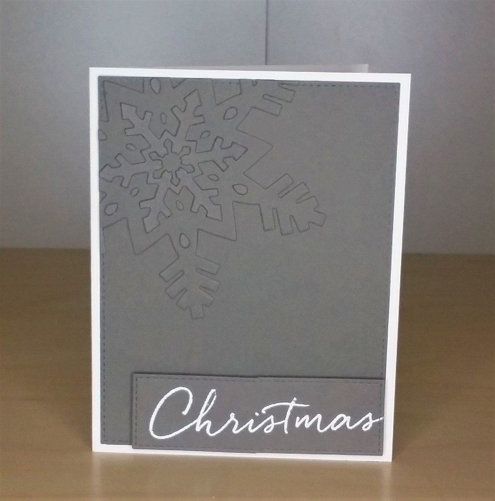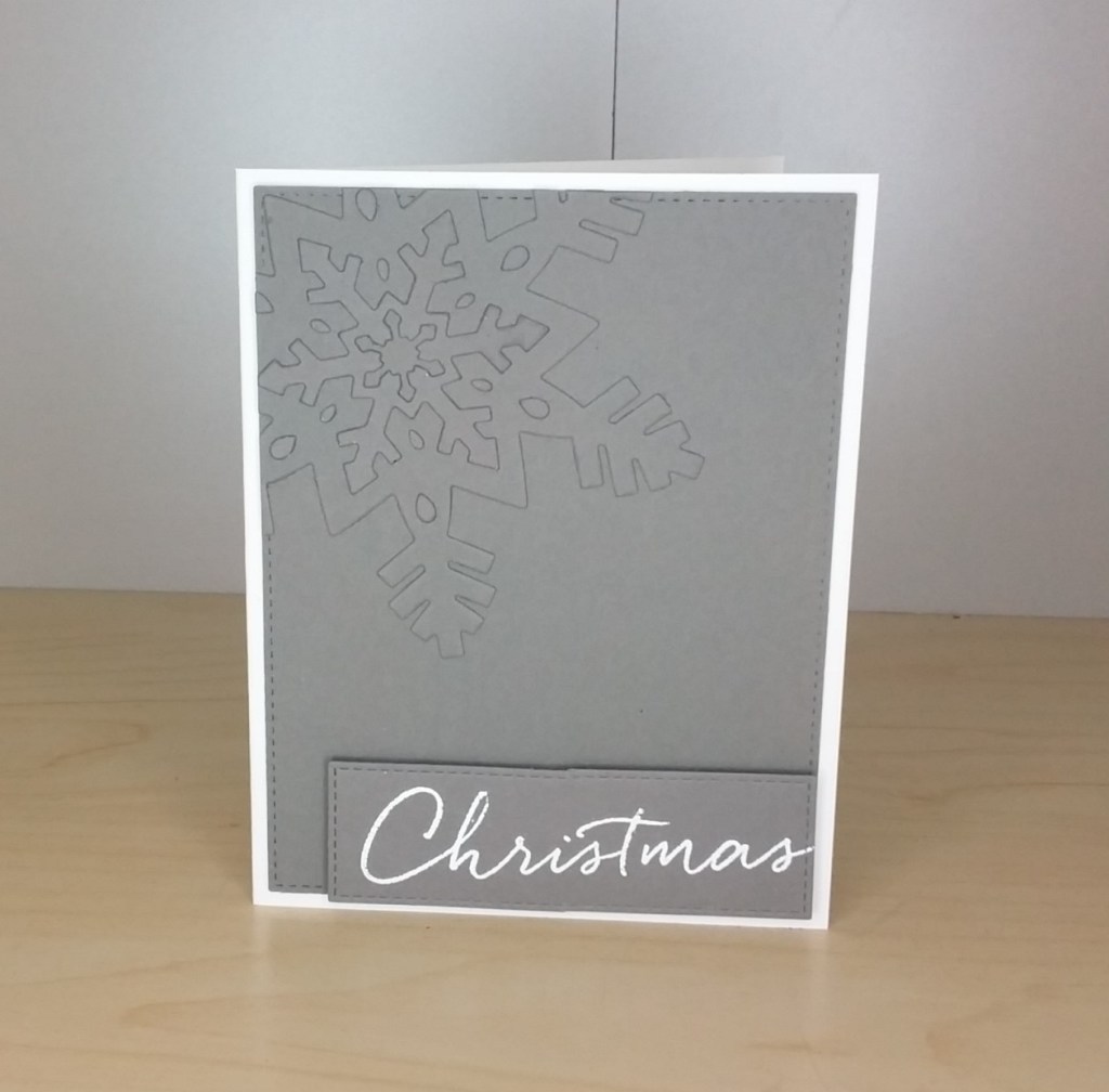 I used Lawn Fawn ‘Fog‘ card stock, and die cut the Concord and 9th snow flakes – with double-sided backing paper on the back – and stuck to a die-cut panel. The smaller snowflake I added on top of the larger snowflake, and some of the little tear-drop excess pieces I stuck onto the larger snowflake as you see.
