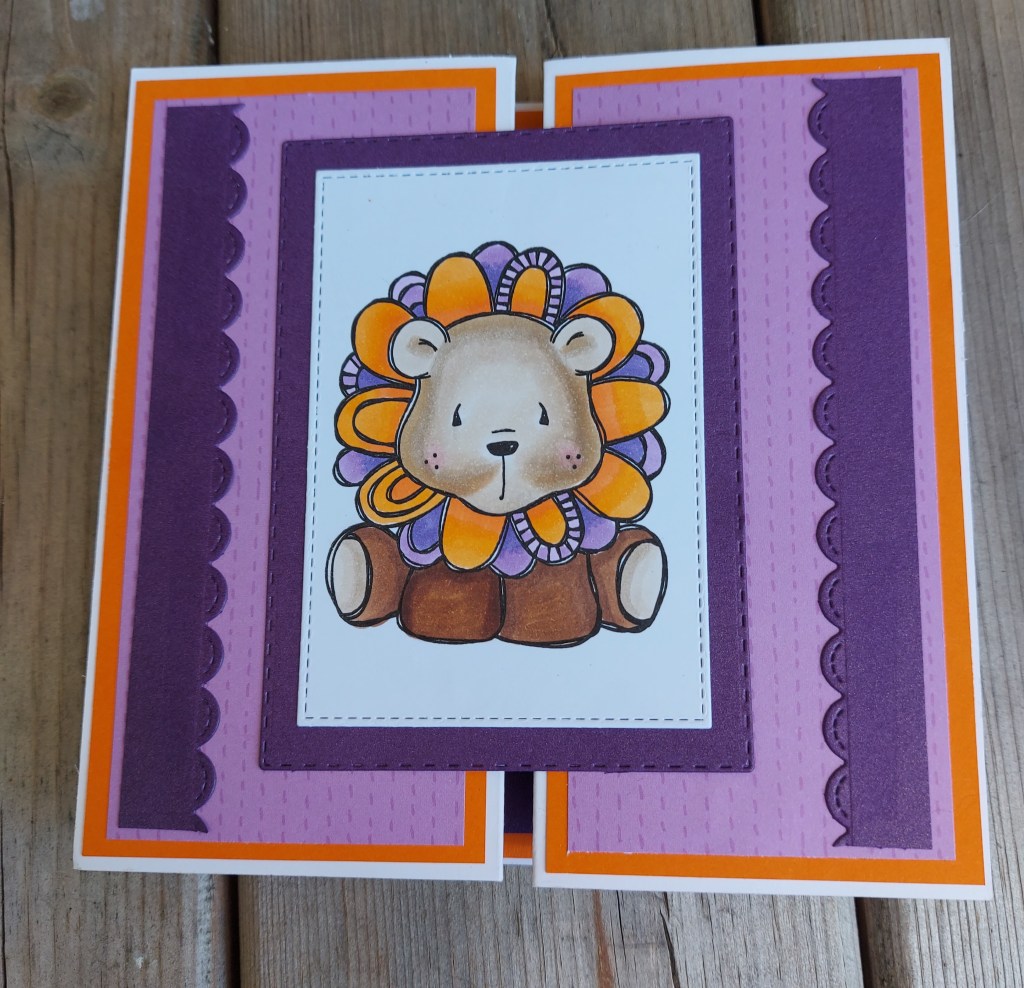 After creating the card base I looked to use a large image for the rectangle on the front. I used the Tracey Hey Designs ‘catitude’ stamp set, and coloured the lion image with Copics – some minor shading, but not too much.