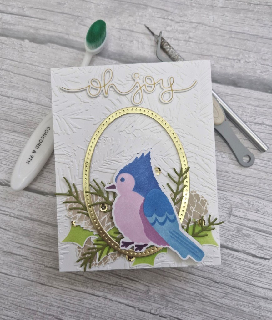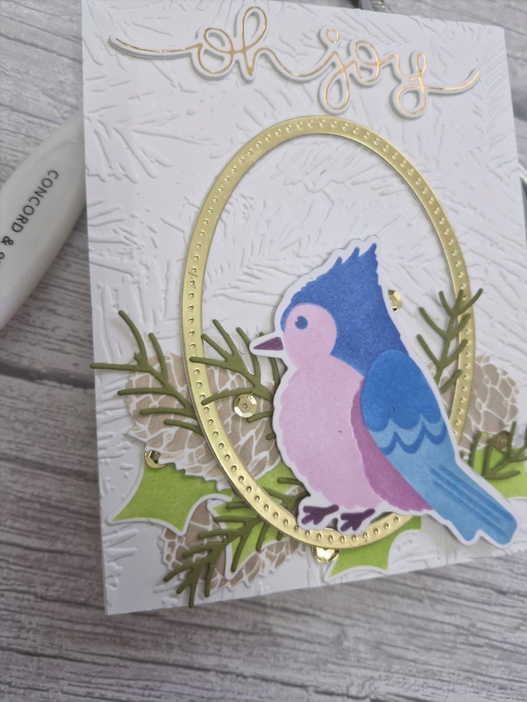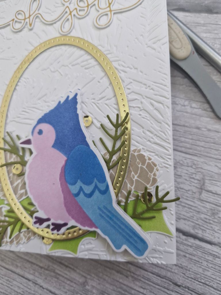I first started by ink blending the background panel. This is a layering stencil set from Spellbinders, and I used Pinkfresh Studio inks. This panel was cut down slightly so I could add it to a dark green card base allowing a small border.