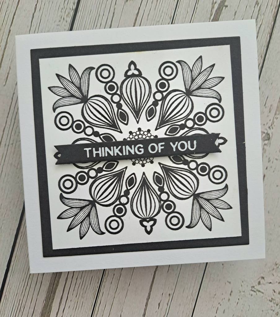 I knew I wanted to use more of the Thirsty Brush and Co stamp and die sets, and wondered how they would look in black and white. I must admit I like this – so I made another using the reverse effect: