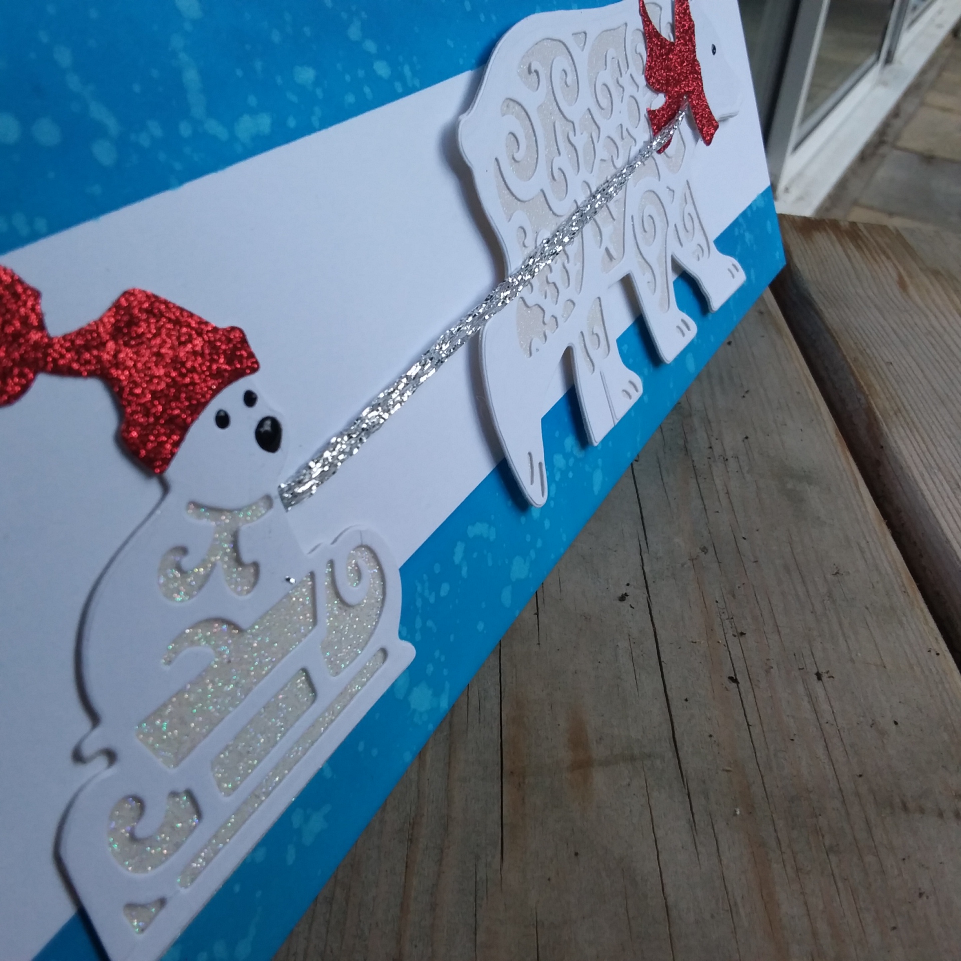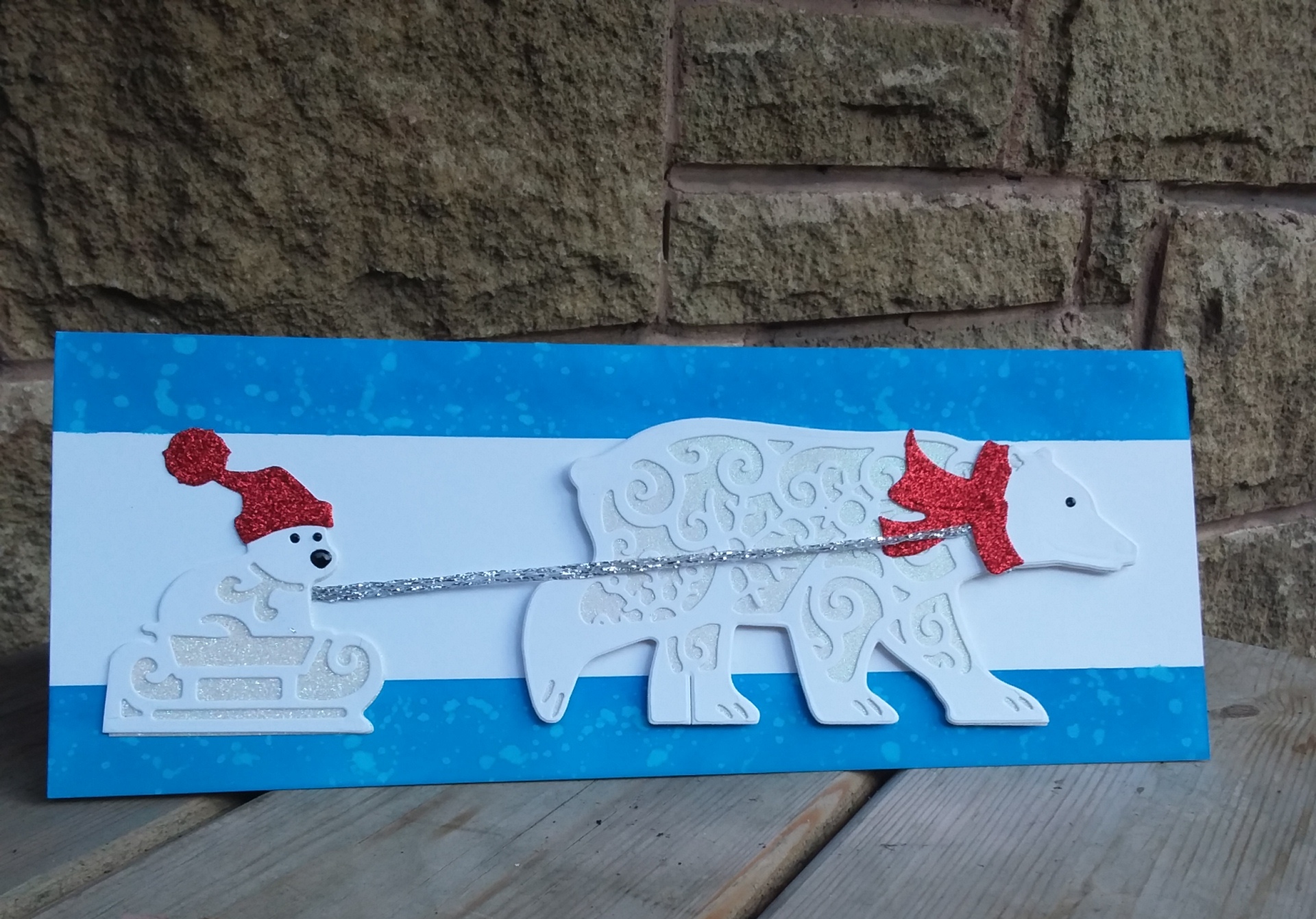 I started by die cutting the polar bear the baby using Creative Expressions ‘Paper Cuts 3D collection – Polar Bear‘. I didn’t use the 3D elements to stand the baby in front of the parent, but instead used some glittery silver twine – as though the baby is being pulled along on the sled.