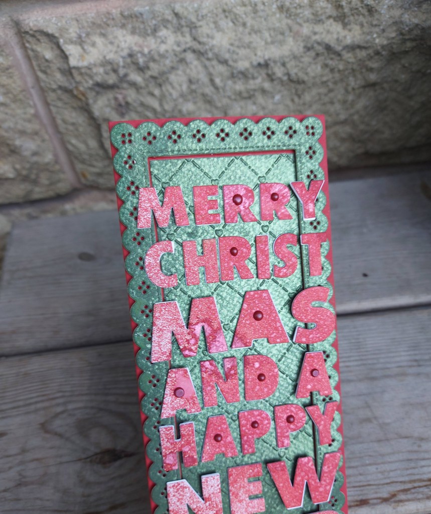 The letters were added as you see. The scallop frame is raised using 3D foam strips, so I added the letters to get the same height all round, as they didn’t quite fit into the frame – but I wanted it to work so I just got on with it, and some part of the letters on the edge were glued directly onto the frame.