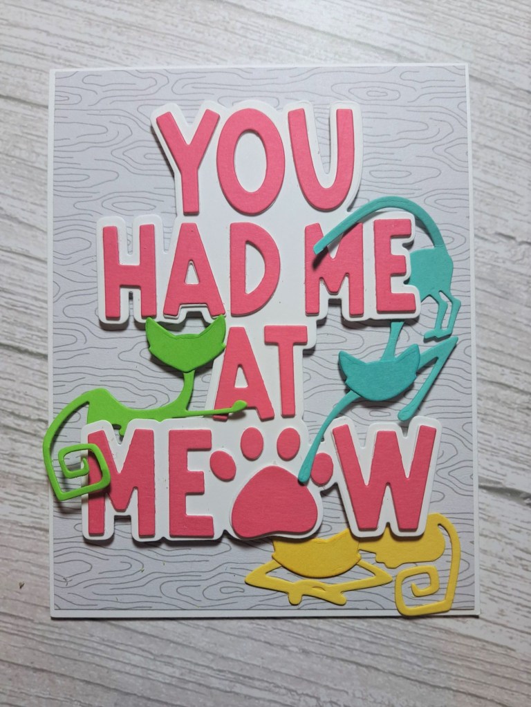 The cats are from a Tim Holtz die set, the die set aptly called ‘Mischievous’, and I chose the three cats which I would be able to intertwine around the sentiment – again in bright and cheerful colours.