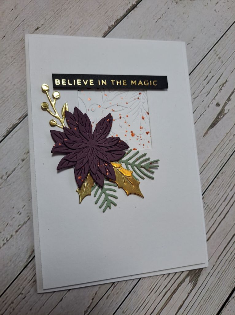 The sentiment is from Spellbinders, one of their debossed sentiments into their shiny gold card stock. Spellbinders gold card stock is a particular favourite of mine as it’s double sided, and die cuts so beautifully. It is sometimes a little tricky to glue down – sliding around – so you have to be careful until it ‘grabs’.