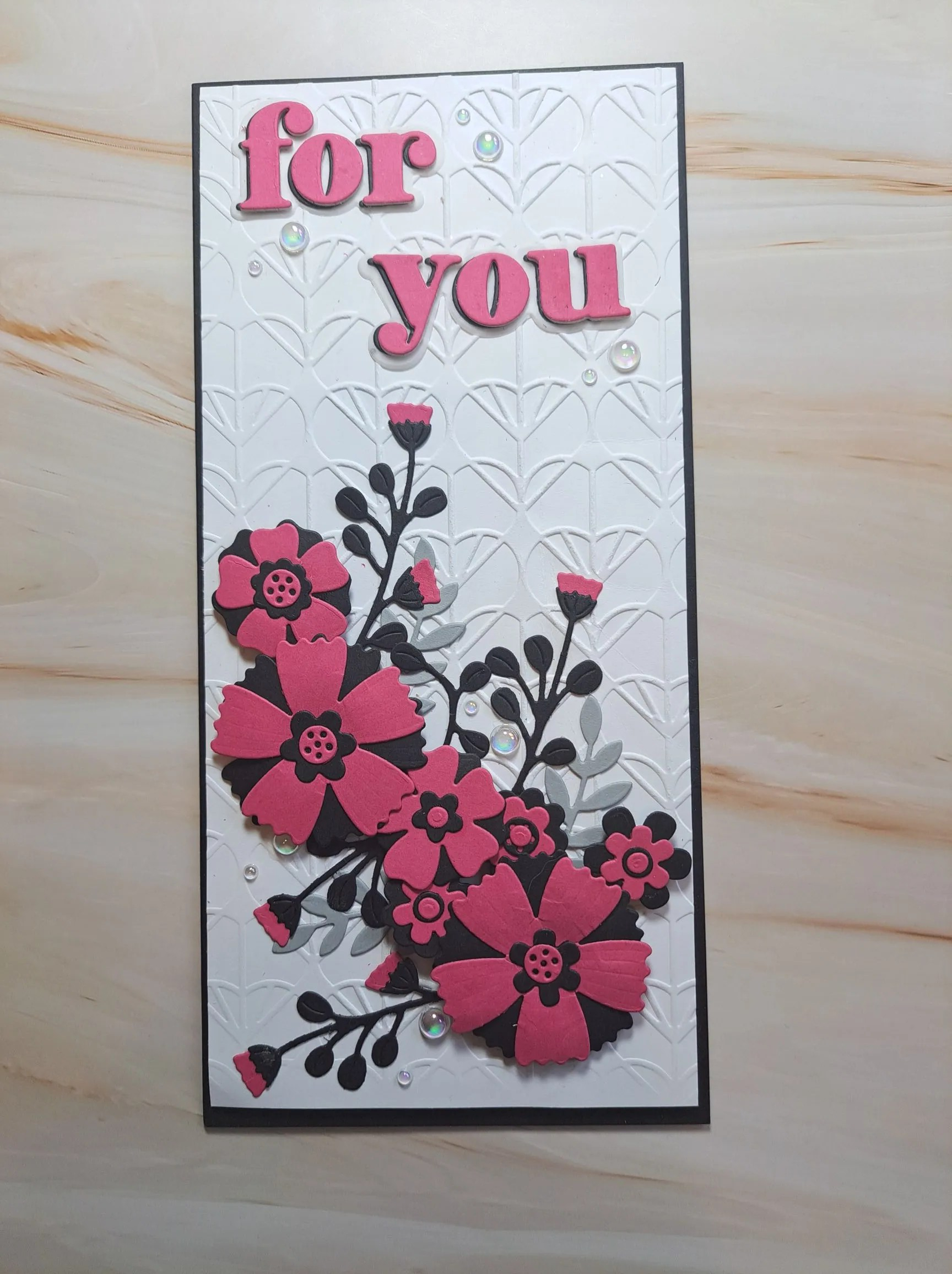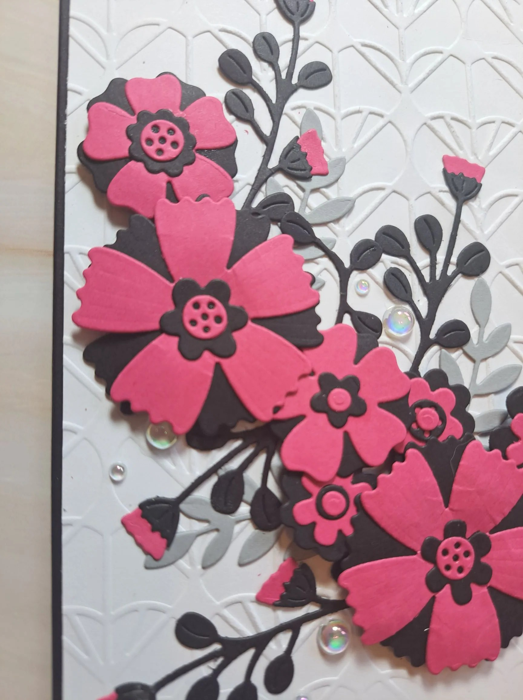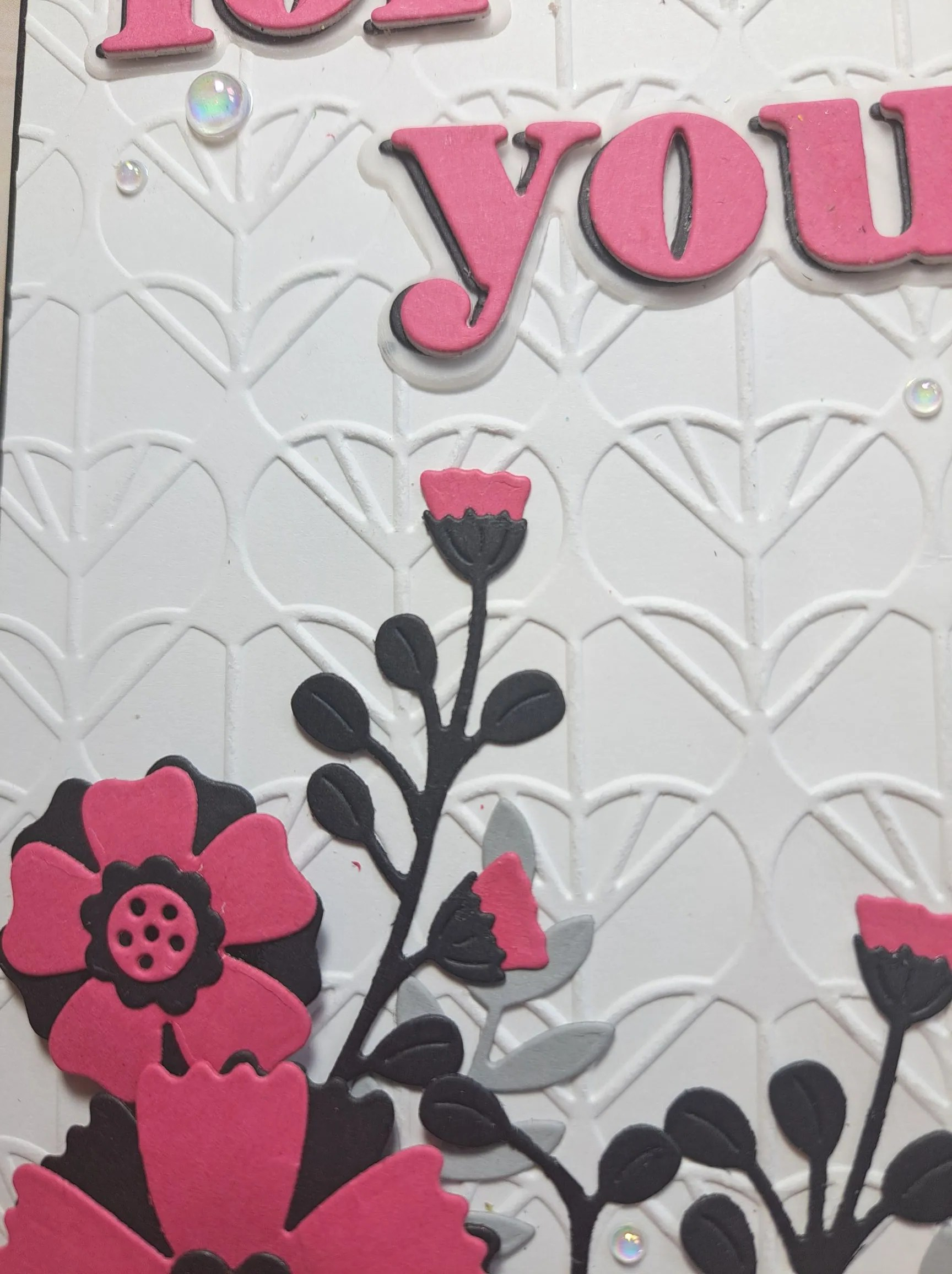 I used a Spellbinders embossing folder to create a panel, then added the Pinkfresh Studio deco frame from white card stock, raised with 3D foam.