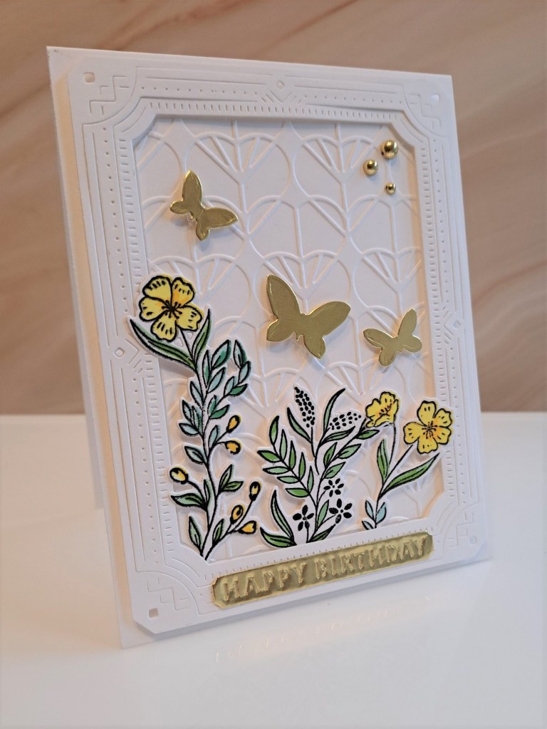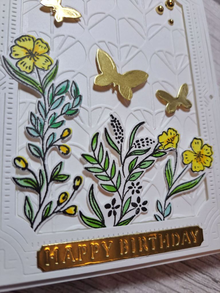 The flowers were stamped, coloured using the matching stencils, then die cut. These were arranged as you see, adding some gold butterflies and some gold dots.