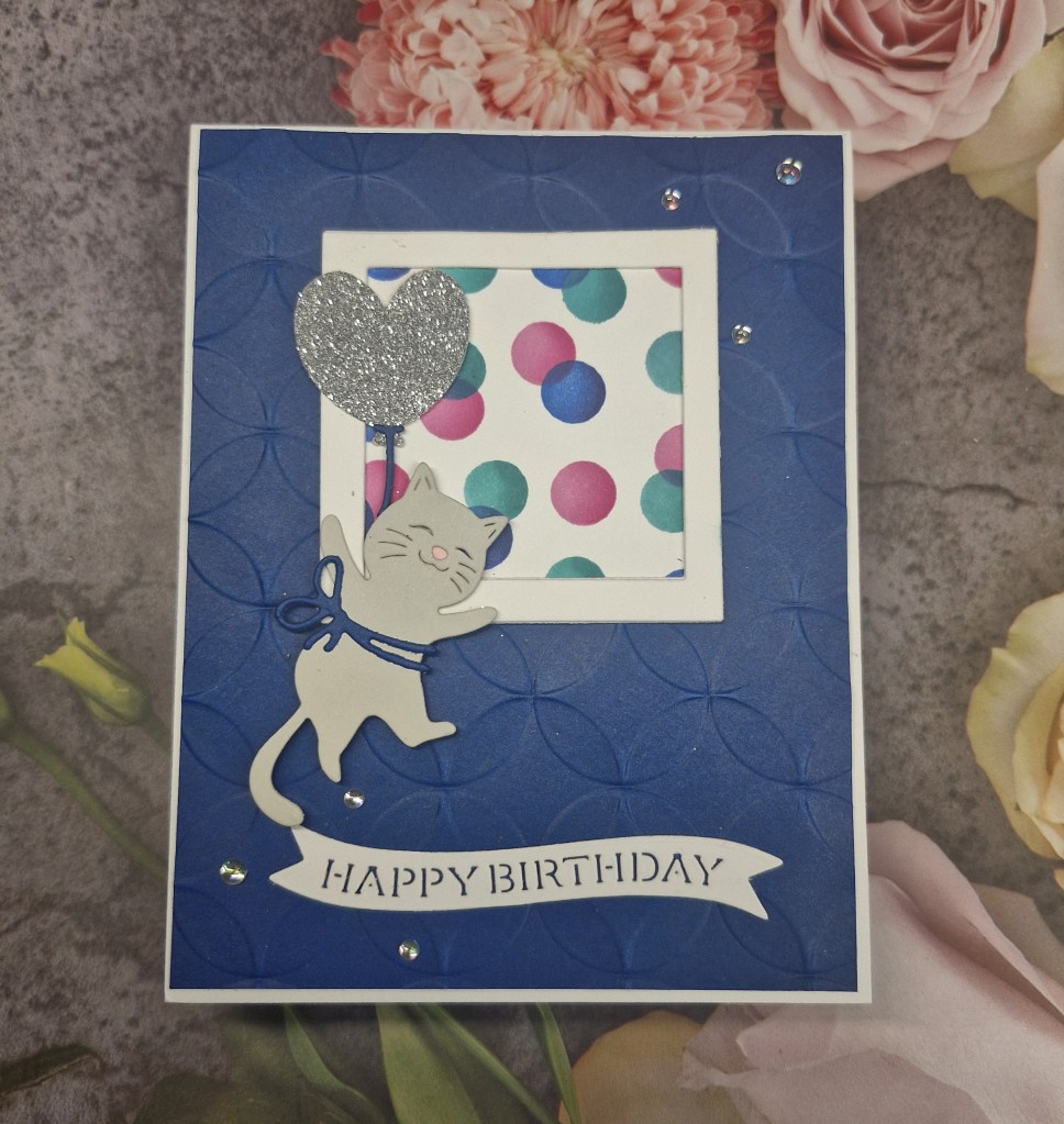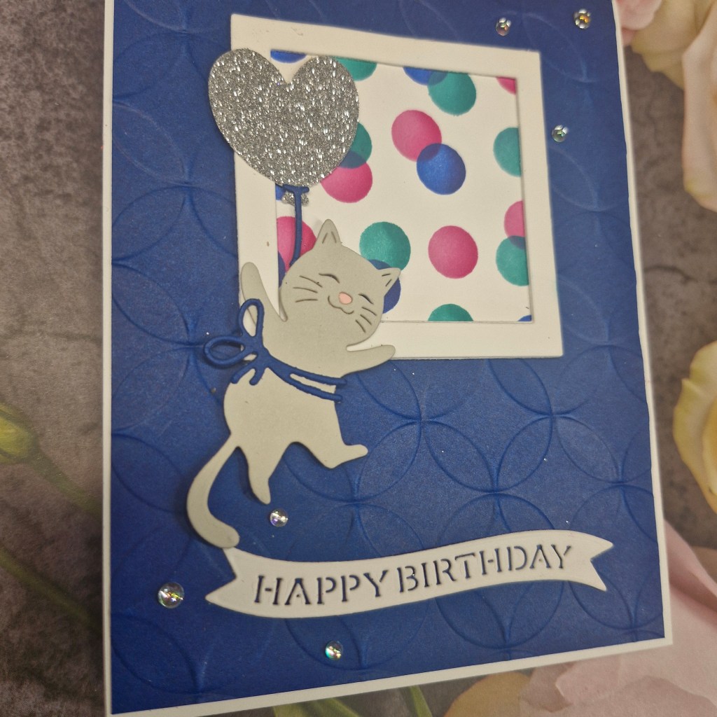 The cat and balloon were also from the advent calendar, die cut as you see, with the balloon being die cut from a silver glitter card stock. These were added, and the sentiment glued below, with some gems top right and bottom left for a little extra sparkle.