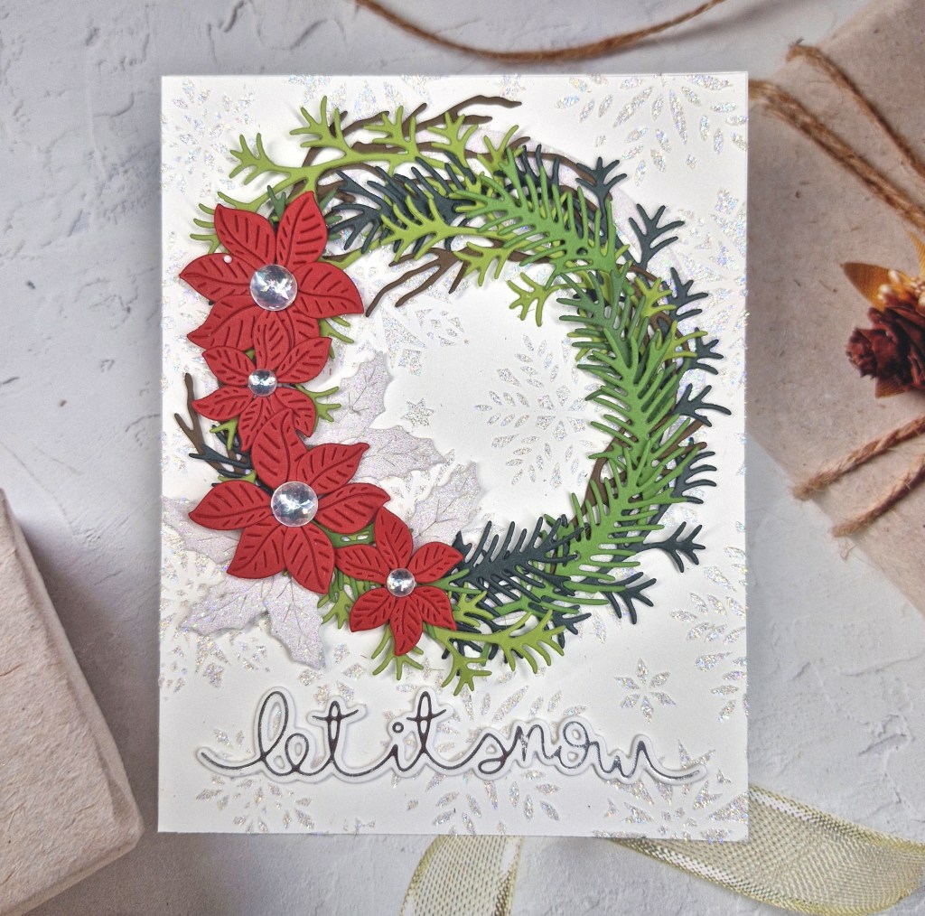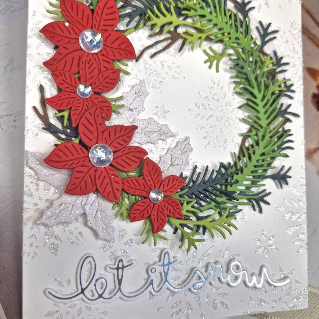 I used a few shades of green for the foliage, a brown for the branch dies, red for the poinsettia layers, and I used silver glitter card for the holly leaves. Once all die cut, and the back panel was dry, I created a circle frame using some nesting circle dies and stuck that down, so I had something to follow when arranging all the elemnts.