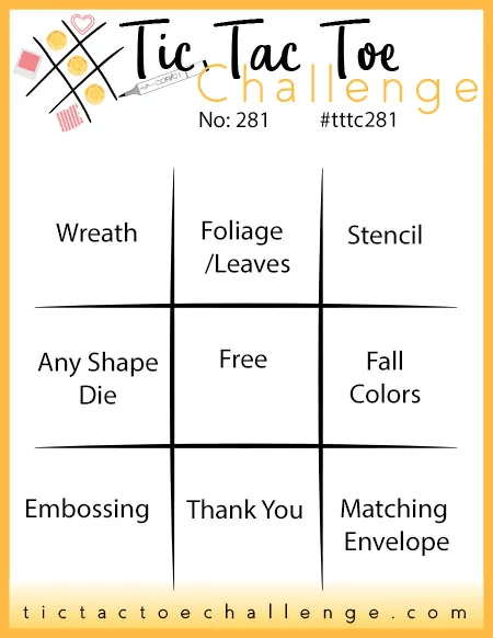 The starting point for my card was the top row of the current challenge at Tic Tac Toe – wreath – foliage/leaves – stencil.