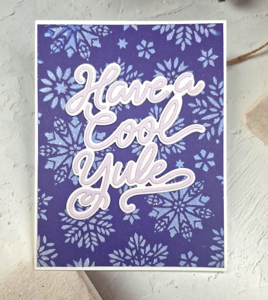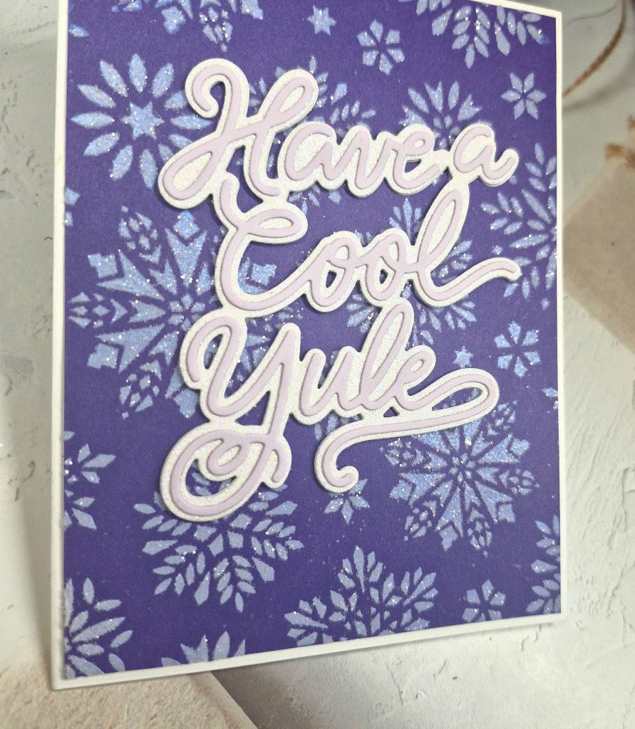 That had to dry for a while, so I used the sentiment die from Hero Arts (a product received from another recent virtual event) using white glitter card stock for the shadow layer, and lilac card stock for the top most sentiment layer.